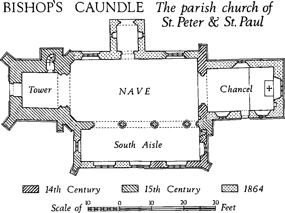 LOCATION † One of 3 ‘Caundle’ churches in the area, and well worth visiting as trio linked by meandering lanes and puzzling signposts. Bishop’s is about 4 miles S.E. Sherborne on a road leading E. to Sturminster Newton. An elongated village with a typically attractive Dorset church. 50.9171 / -2.4336 / ST696131