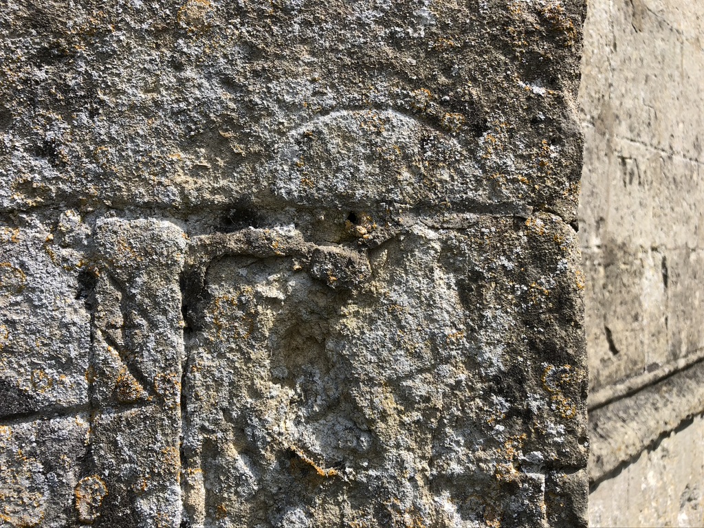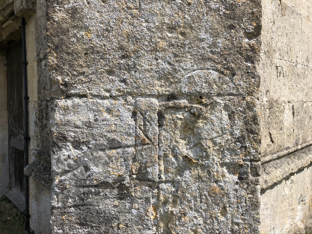 Badly eroded and degraded, the dial is located on the SW face of the buttress S of the W door. Apart from the semicircle at the top it is hard to discern how the dial might have looked. At first sight, this is a dial cut across 2 stones (there’s a hint of a circle on the lower stone), with the style hole presumably lost in the damaged area (the mortar line looks too high for one). Listed by TWC; not in the BSS register