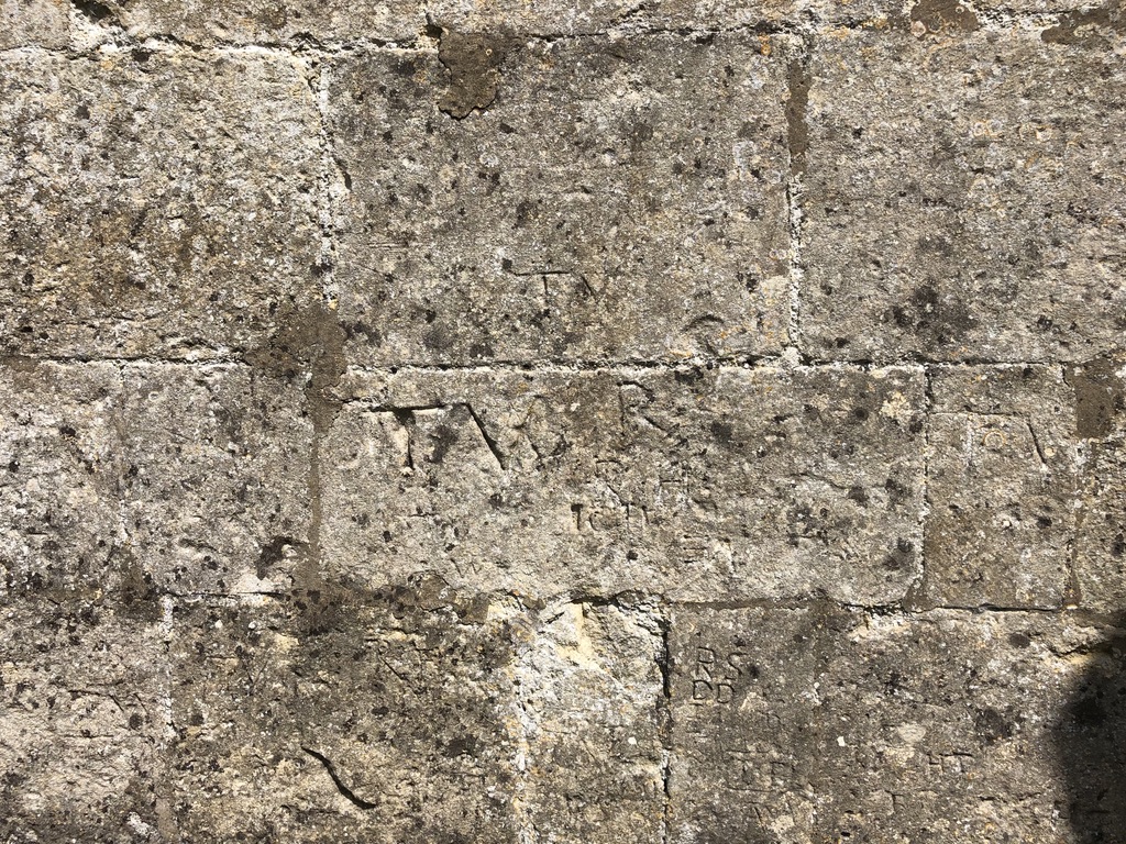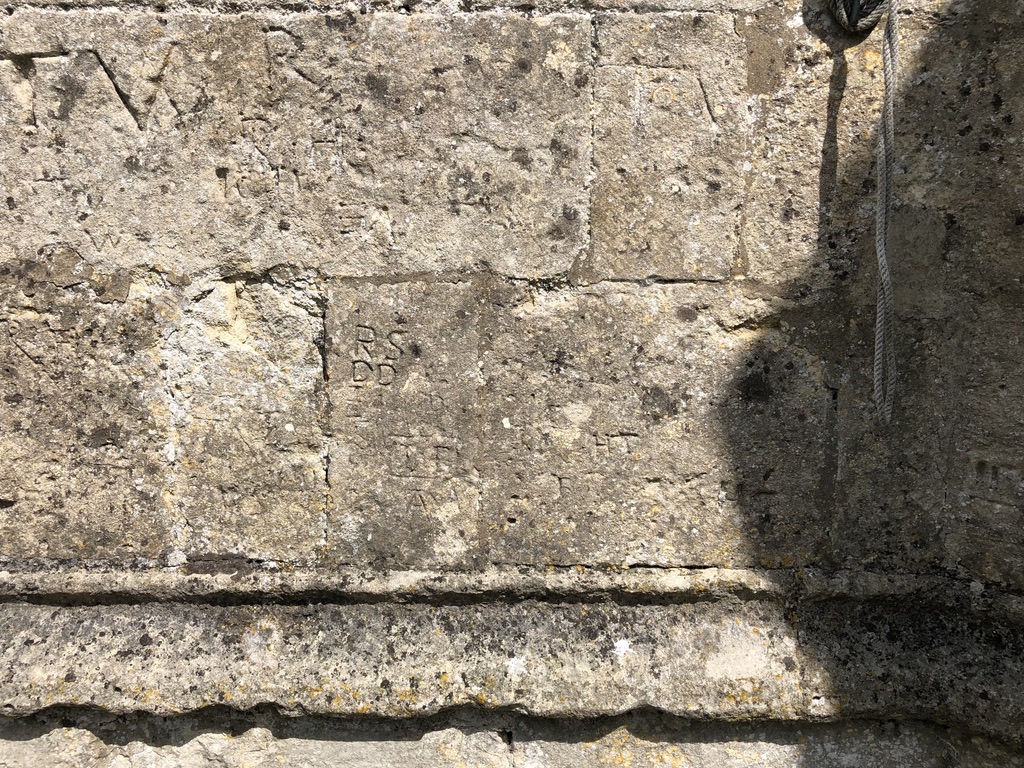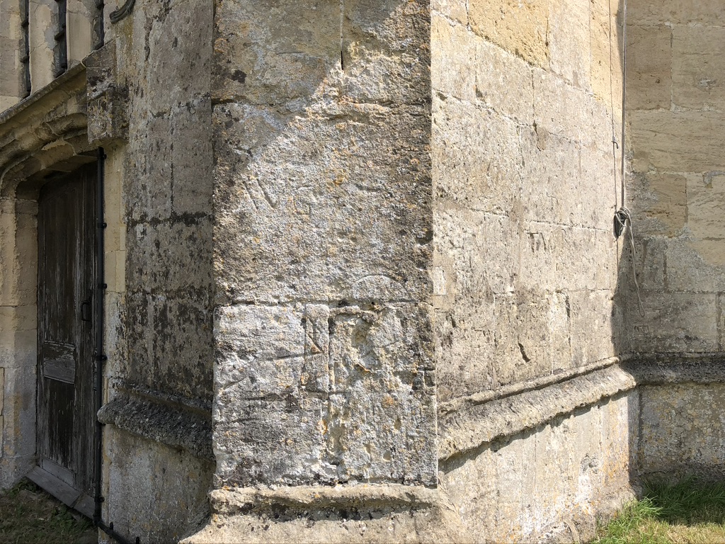 Apart from the dial, there are quite a few witch marks and graffiti / initials. I take the double triangle mark beside the dial to be an emphatic ritual protection mark rather than, for example, a mason’s mark.