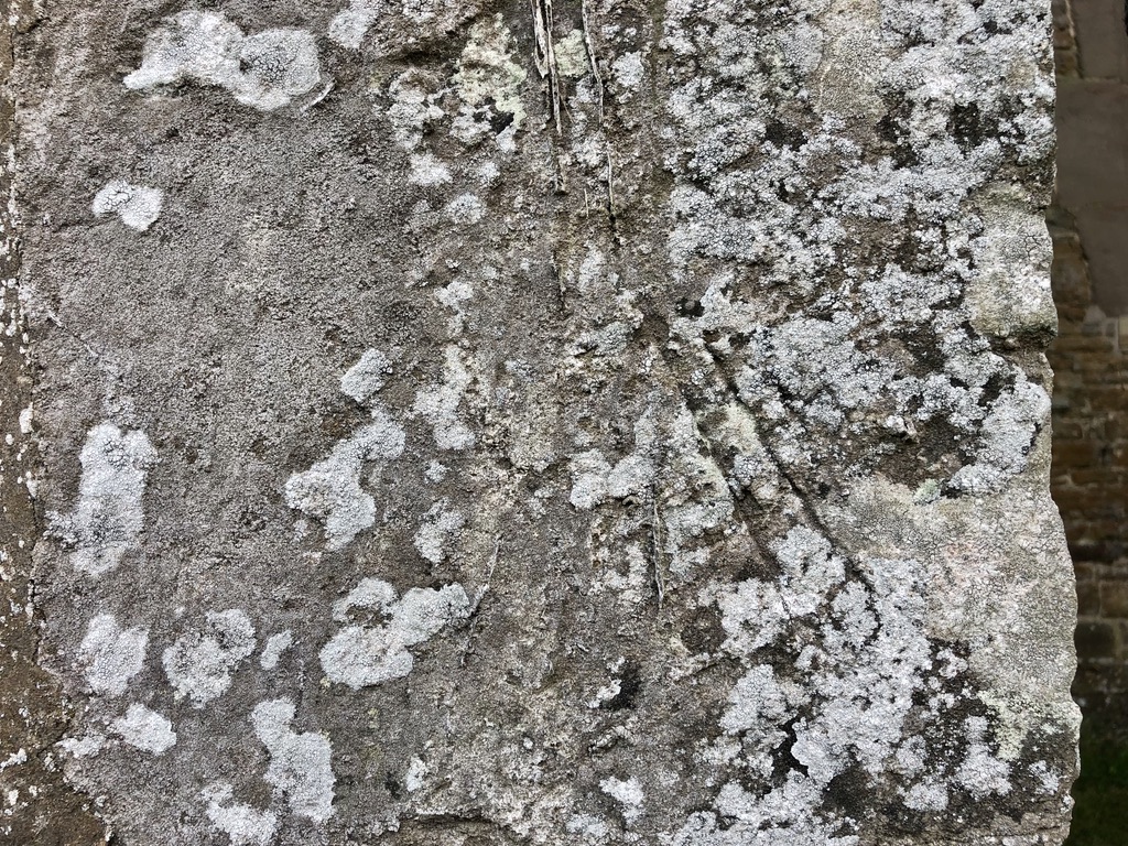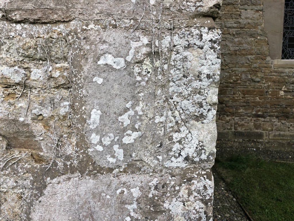 To W. of the priest’s door and the large window to its right is another dial, unrecorded as far as I can tell. It is low on the buttress, 3 stones up from the base. There are 7, perhaps 8, lines radiating from the mortar line, where there is a small metal plate inserted with an unknown purpose. There are 6 pocks that almost certainly belong with the dial. Regrettably our friend with the drill was unable to restrain his DIY instincts on 3 of them.