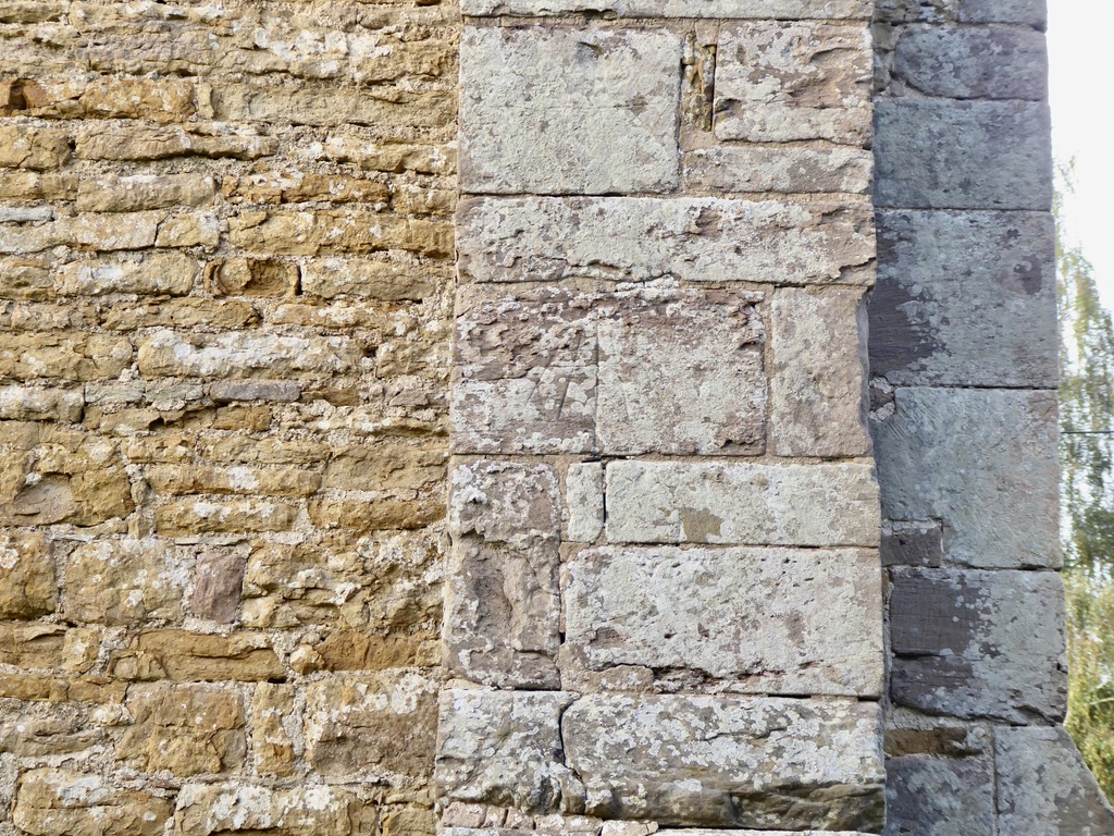 On the 4th quoin up on the E end, amidst some dead ivy stalks, there’s a further dial candidate. There are 3 noticeable lines and faint traces of a couple more. There is a plausible style hole at the apex of the lines. At the time I wondered whether the design should be awarded dial status. Having examined the photos I now think it should be. All the main criteria are met (location, position, radials, style hole). Luckily the driller has not plied his trade here.