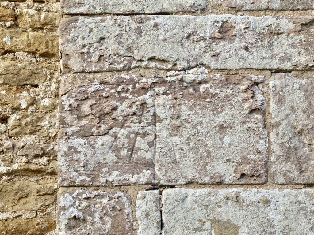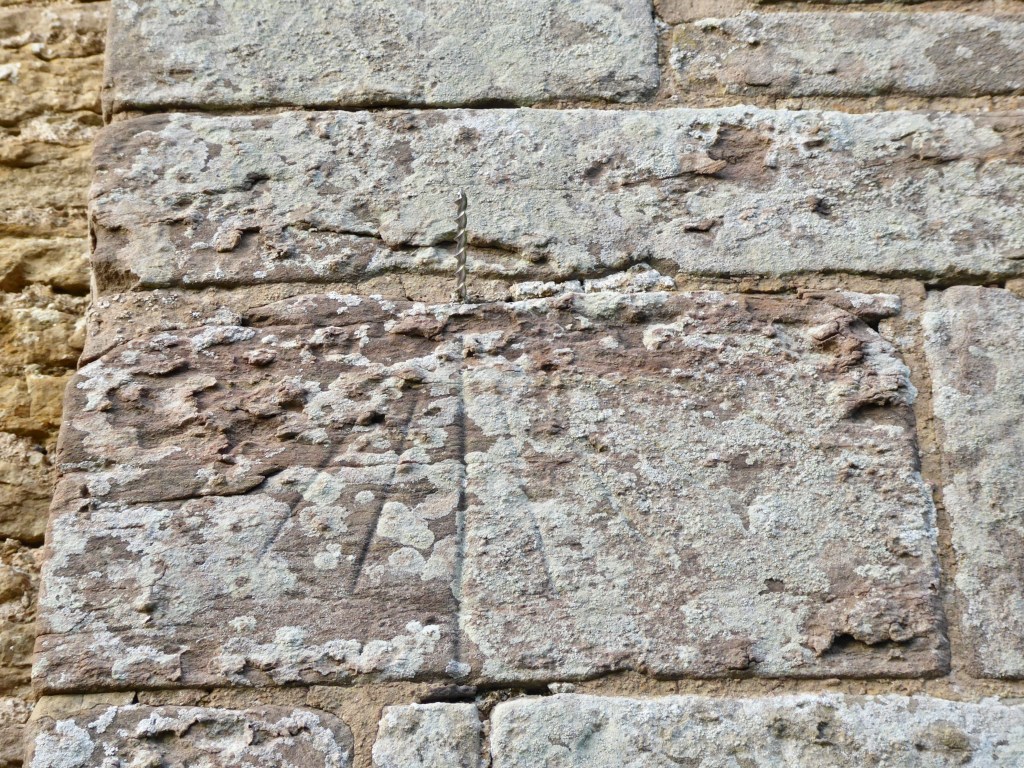 This recorded dial is quite high (3m approx) on the buttress at the E. end. There are 3 clear lines including the deeper, longer noon line that descends to the edge of the stone below. The R side of the dial is eroded, with 2 fainter lines and a third barely visible. The gnomon hole is in the mortar line. The style has amusingly been replaced by a drill bit, the height suggesting that someone took the trouble to get a ladder for the purpose.
