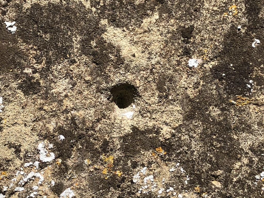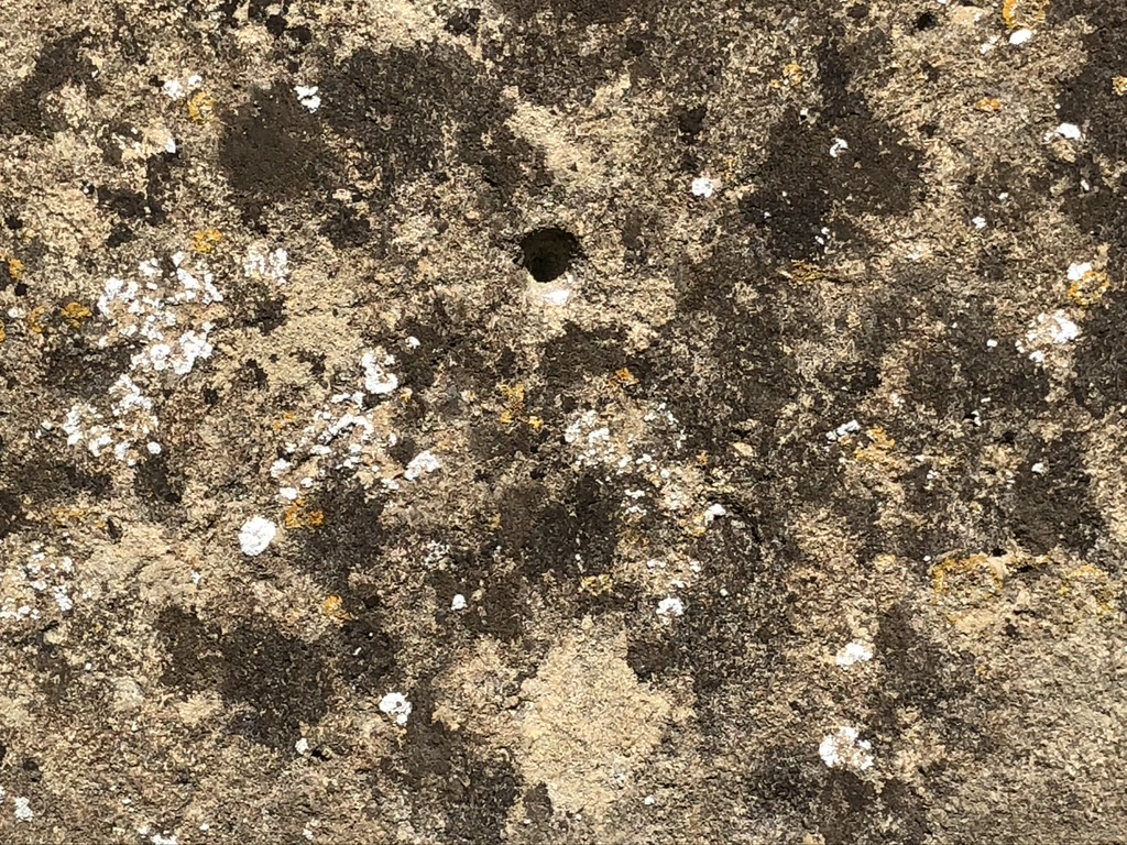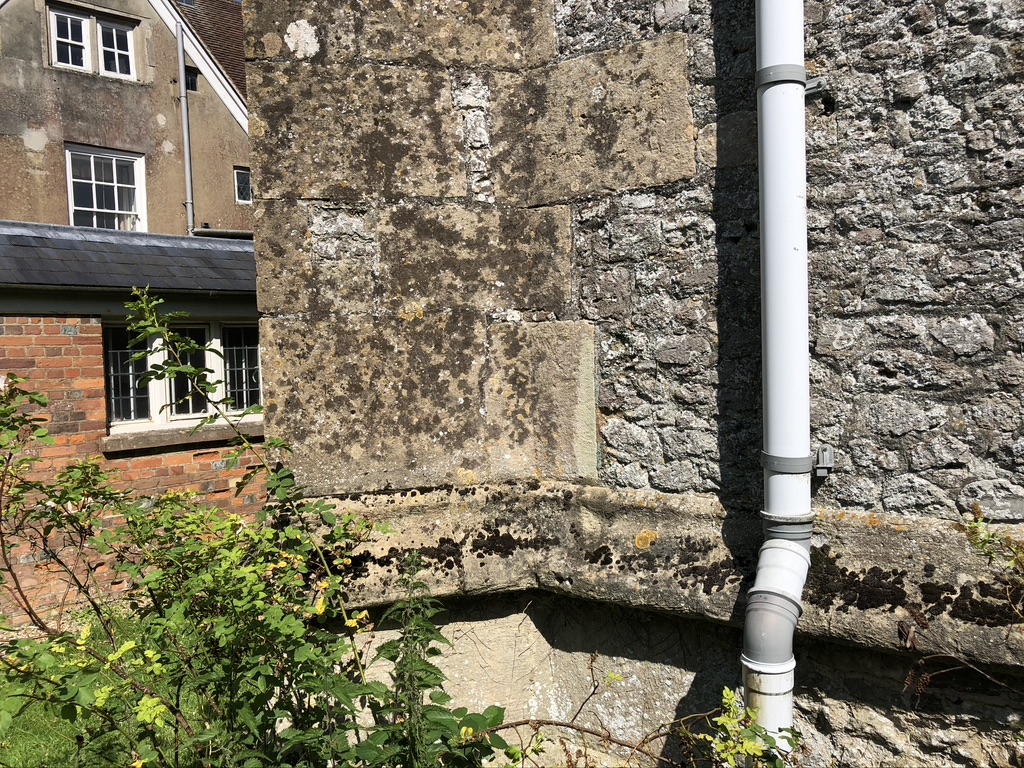 The dial is on the SE. face of the end buttress W. of the porch. The style hole is prominent; the radials are faint and shallow scratched (and / or eroded). 8 are fairly clear, seen close to. The sector containing them is at an unusual angle of (roughly) 7.00 am to 8.00 pm. The obligatory drainpipe is close by.