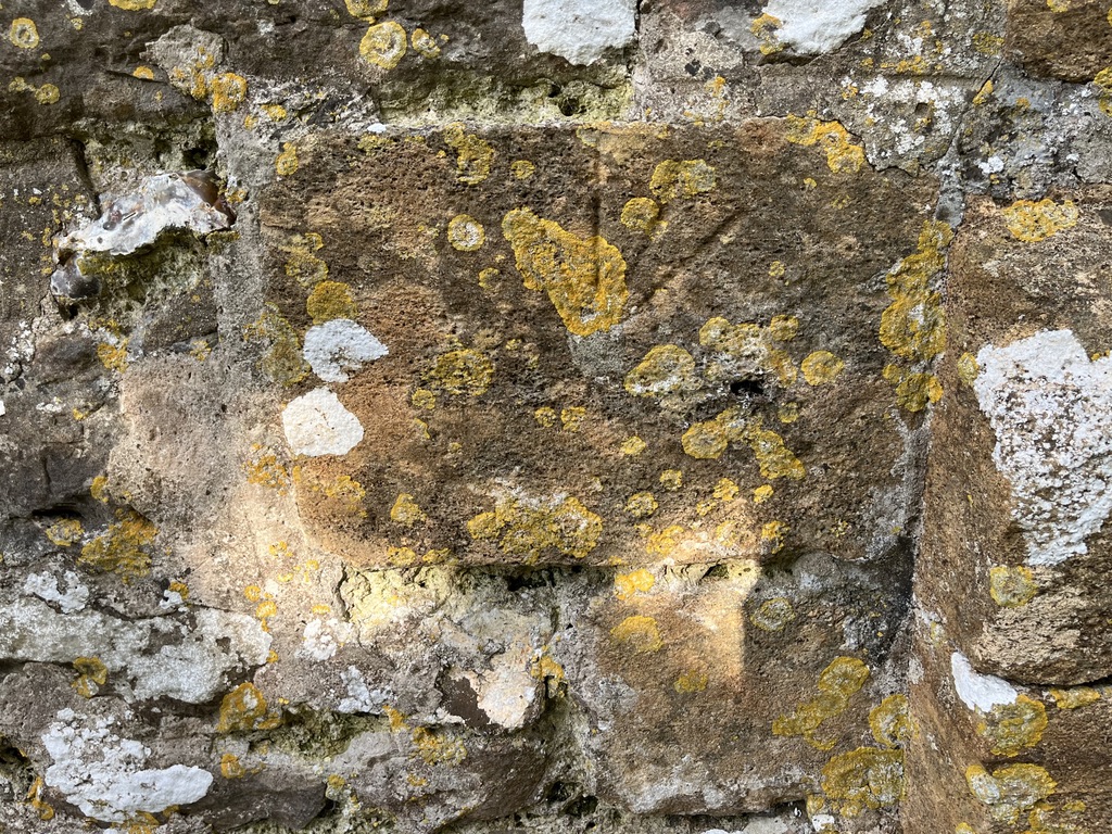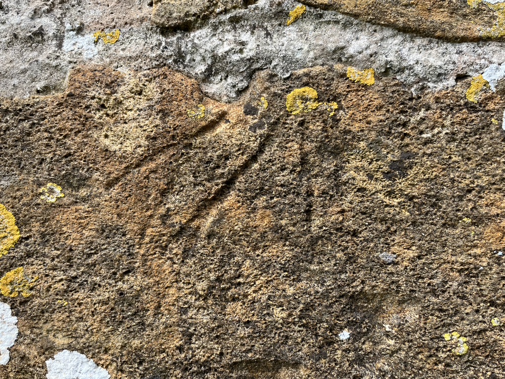 This ‘new’ dial is also low down between the other 2, nearest Dial 1. It is inverted. There are 3 very clear lines of differing widths and depths, with the (upside down) noon line extending to the edge of the stone and ending in a (faint) cross noted by GLP. He mentions 6 lines (3 eroded) in all, and adds This dial would appear to record the Saxon ‘Tides’