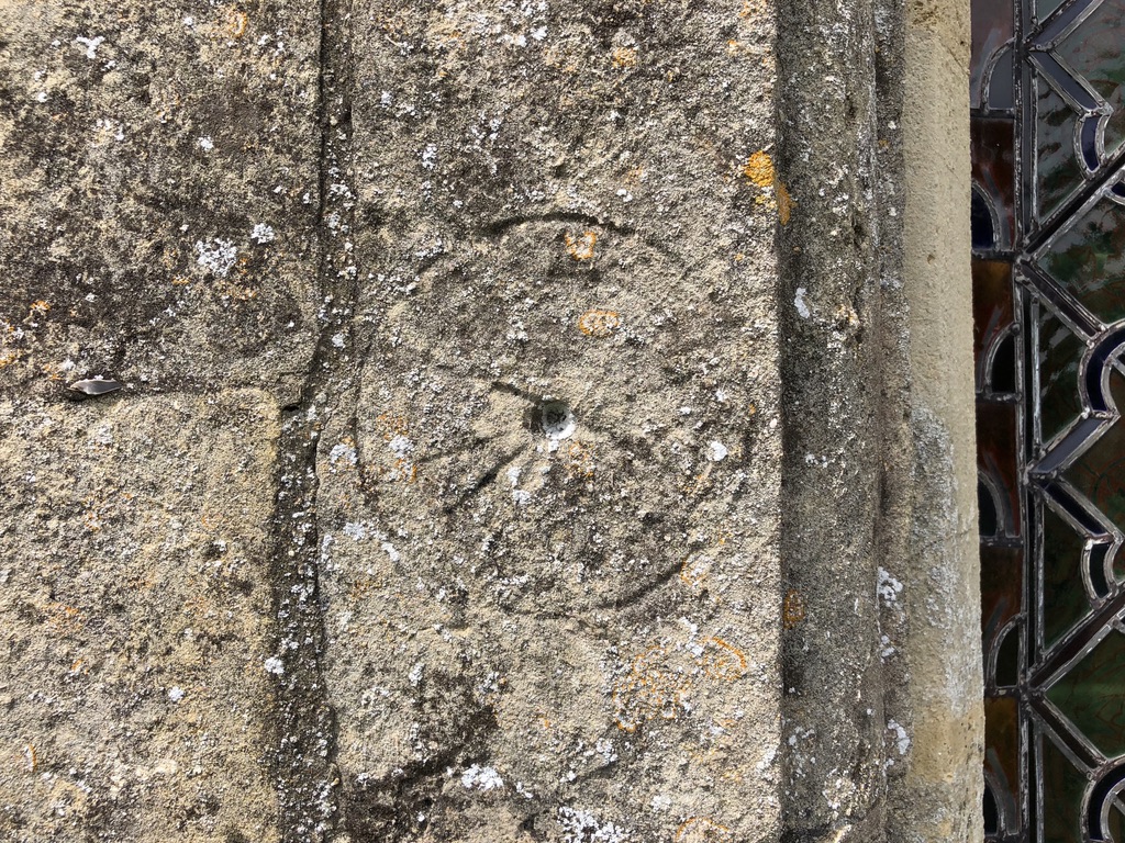 Dials 1 – 4 are all close to each other on the S. face of the transept. Dials 1 – 3 are cut into quoin stones on the W. edge of the transept, nearest the porch. Two are close to each other; the third is higher up (I was fortunate to spot it). All 3 dials are marked mainly in the lower L. quadrant. Dial 4 is a quite different type, within a circle. Located immediately W. of the large transept window.
