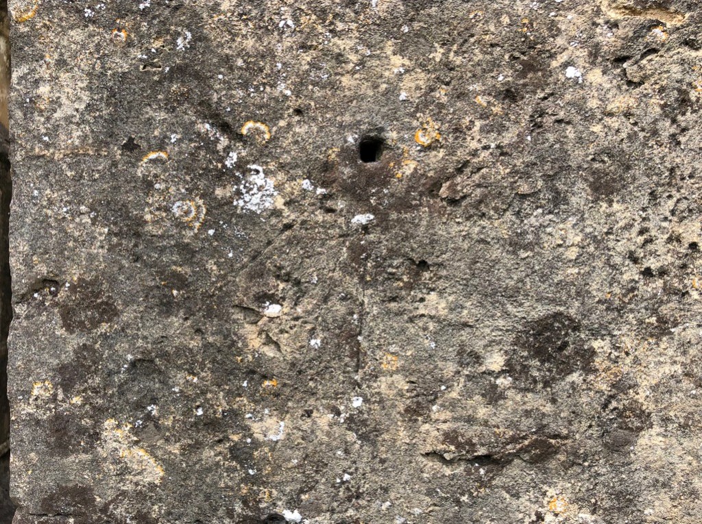 DIAL 2 has a large style hole drilled between the 2 stones that form the horizontal. There are 3 clear lines – the noon line extended – and possibly a couple of faint / eroded lines. Small pocks on the edge are dwarfed by a huge ‘mid-morning’ hole that was perhaps added later – or was a forthright call to Mass.
