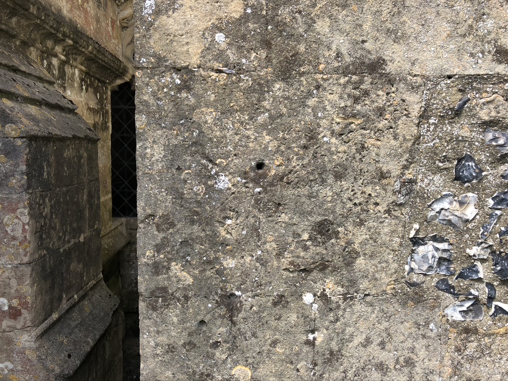 The third dial on the same quoin is much higher, and easy to miss. A large style hole with 3 clear-cut lines, the middle one extended and with a pock at the end. There’s a fainter line R. of the (slightly offset) noon line. Presumably, although the quoin as a whole seems uniform, the stone was relocated to its elevated position.