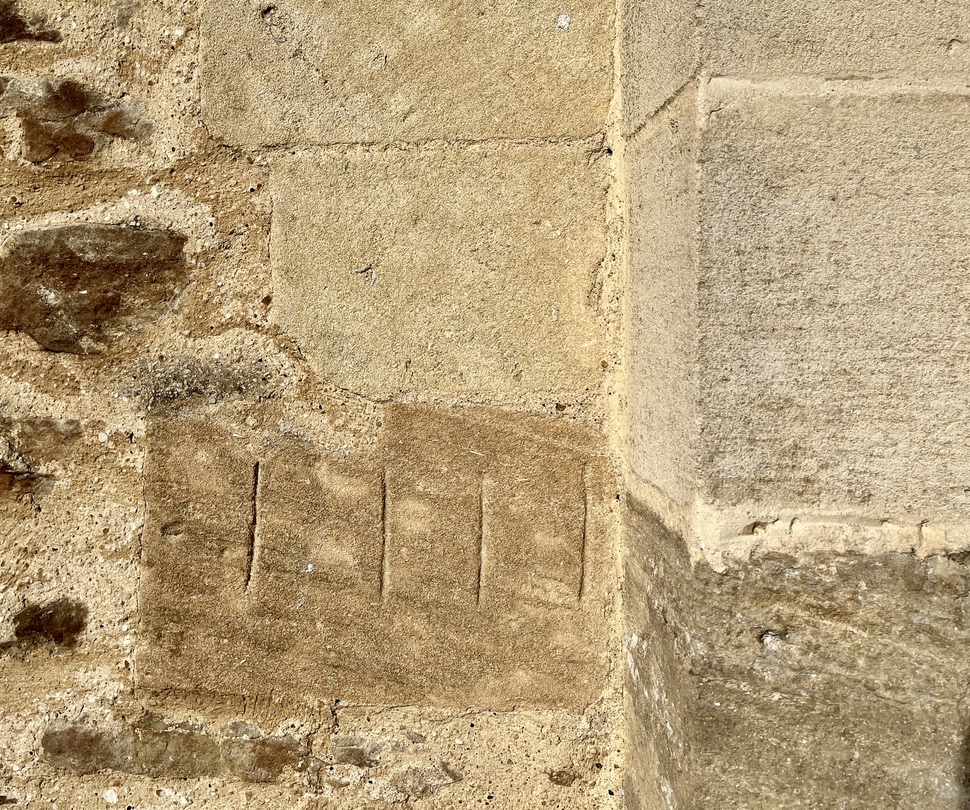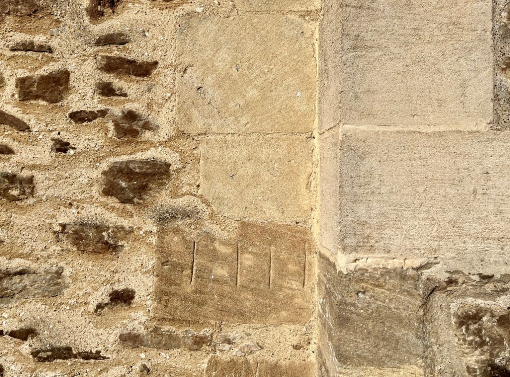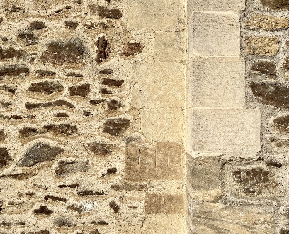This highly unusual dial (if it is one at all) is on the S. side of the church, in the angle where the tower meets the nave. It consists of 4 incised parallel lines on a single stone. Just that. The passage of the day can be observed as the sun moves round, with the quoin acting as a vertical gnomon. The shadow cast moves gradually over the 4 lines from left to right, indicating the time of day. Its position suggests that it was primarily of use as a morning dial, perhaps signifying the Canonical hours for Mass. BSS records it as a ‘linear scale of markings from the wall shadow’.
