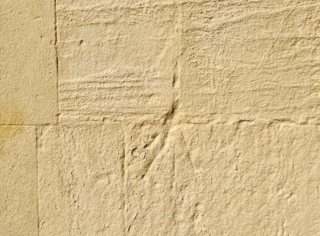 Dial 1 is on the right side of the lovely S. doorway. It has 4 straight radials, 3 with terminal pocks. The noon line may have a second pock above the end one; there are perhaps other dots. The style hole in the join of the stones creates the horizontal line. The careful preservation methods noted above have to an extent made the dial hard to analyse in greater detail. Fortunately BSS has an archive image that predates recent work. Much more detail is evident; for example the pocks are clearer (and there are more of them). It makes for an interesting comparison.