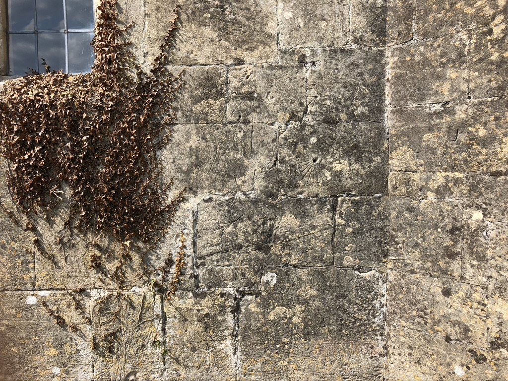 Dial 9 is quite different for all the others, and on its own at the W. end between window and buttress. A small simple circle precisely cut, a large style hole for its size, and a single line with a (possibly related) pock. The line is in almost the same position as the those noted above as possibly marking the most significant Mass for the church. Possibly a trace of a noon line (and extended?). I didn’t notice it at the time but the image hints at one.