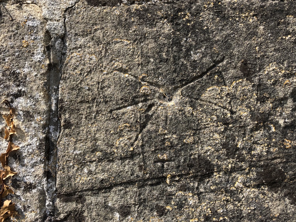 Dial 5 sprawls at a slightly tipsy angle across a stone lower down. 6 distinct lines of differing depths and a couple of traces; partial pocks; and a large cross at the end of the noon line. Other marks, whether existing or added later, rather confuse the overall picture.