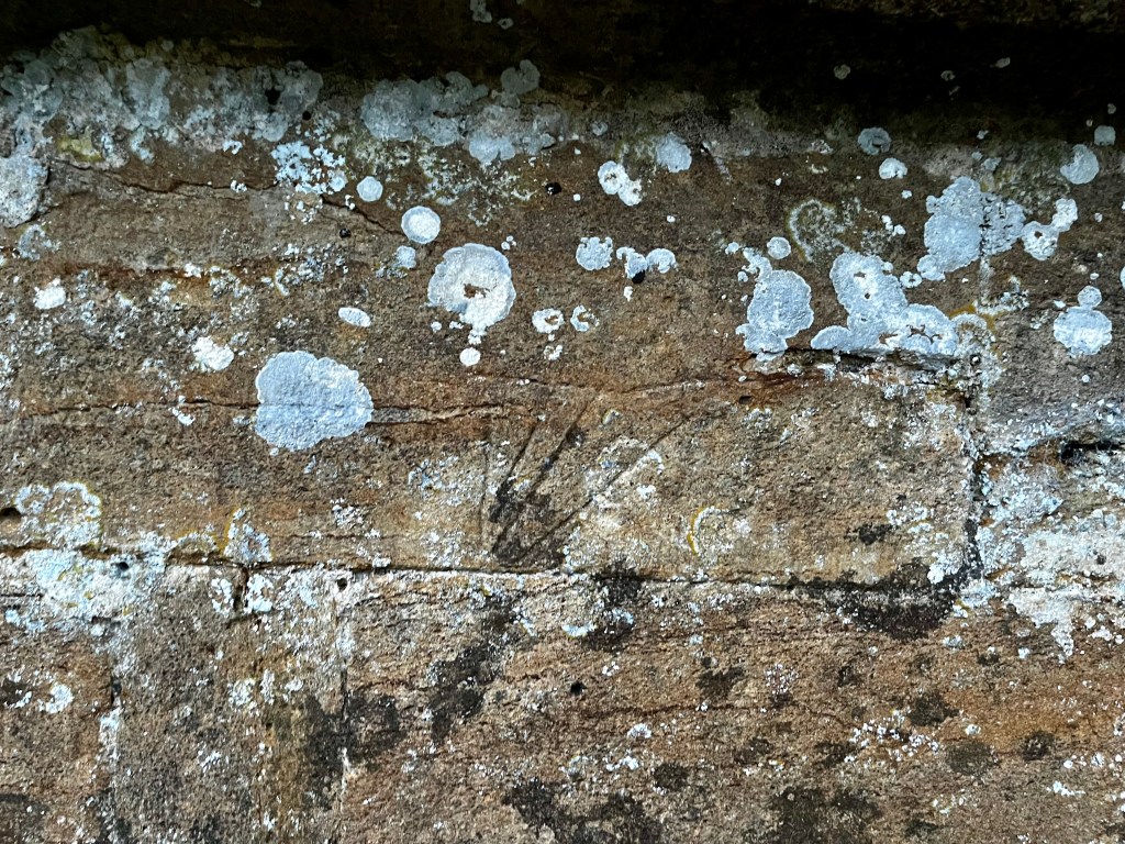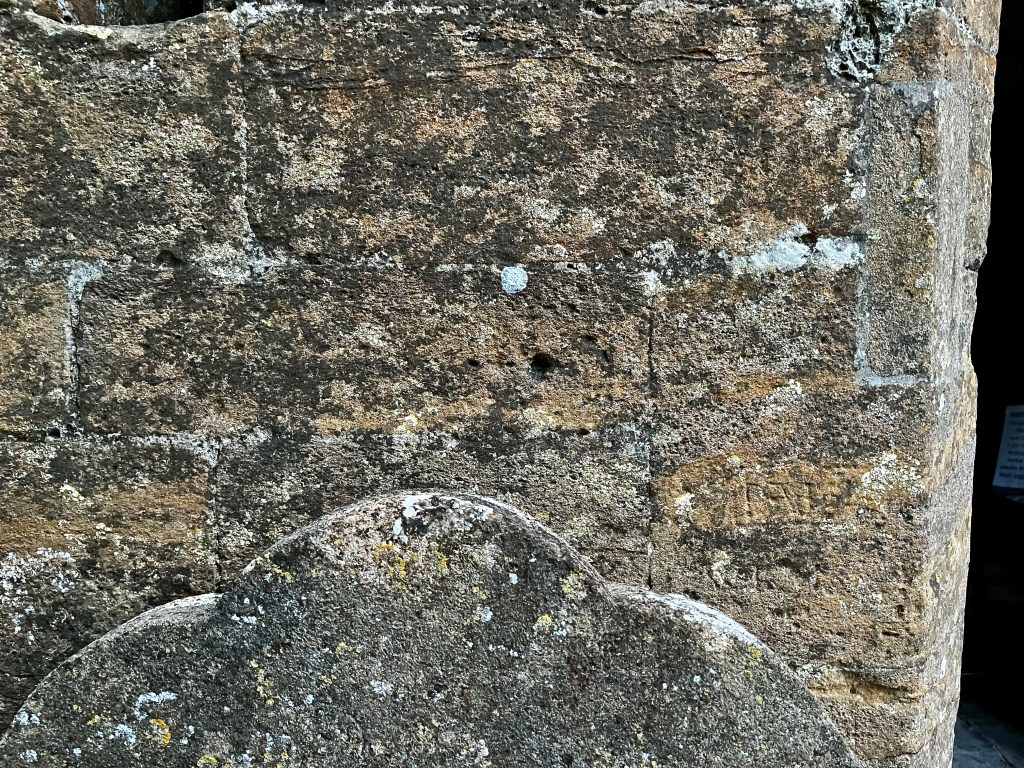Dial 2 is located quite high on the E face of the S porch, a simple 4-line fan dial. The position makes no sense for a sundial, and it was plainly relocated at some stage. In the process, as is often the way, it was inverted. This re-siting with a rotation of the stone retains the decorative feature even though no longer a reliable time indicator. This is the sort of find that reminds me always to search beyond the normal dial locations of porch, buttress and priest’s door.