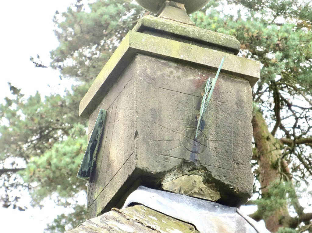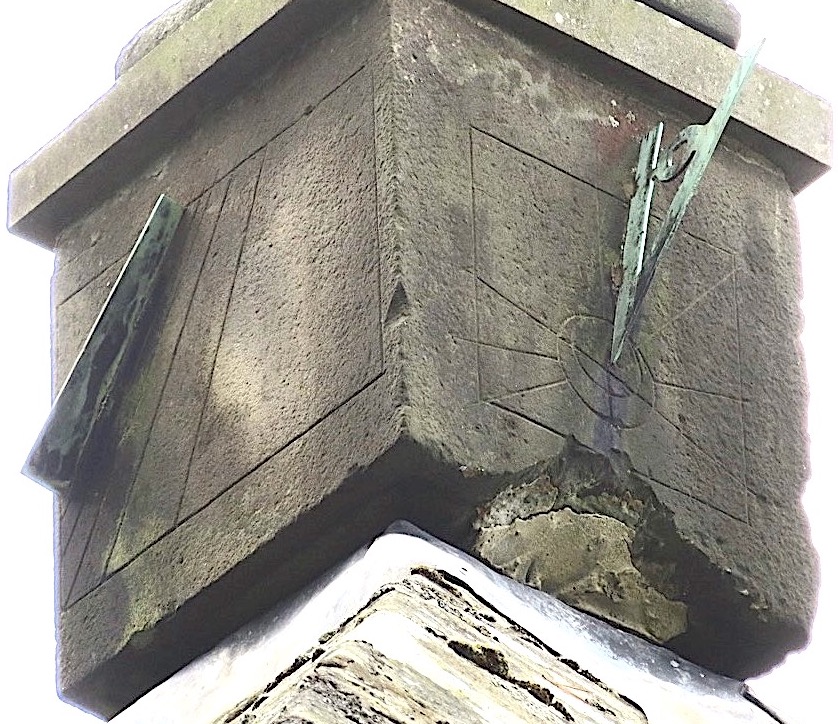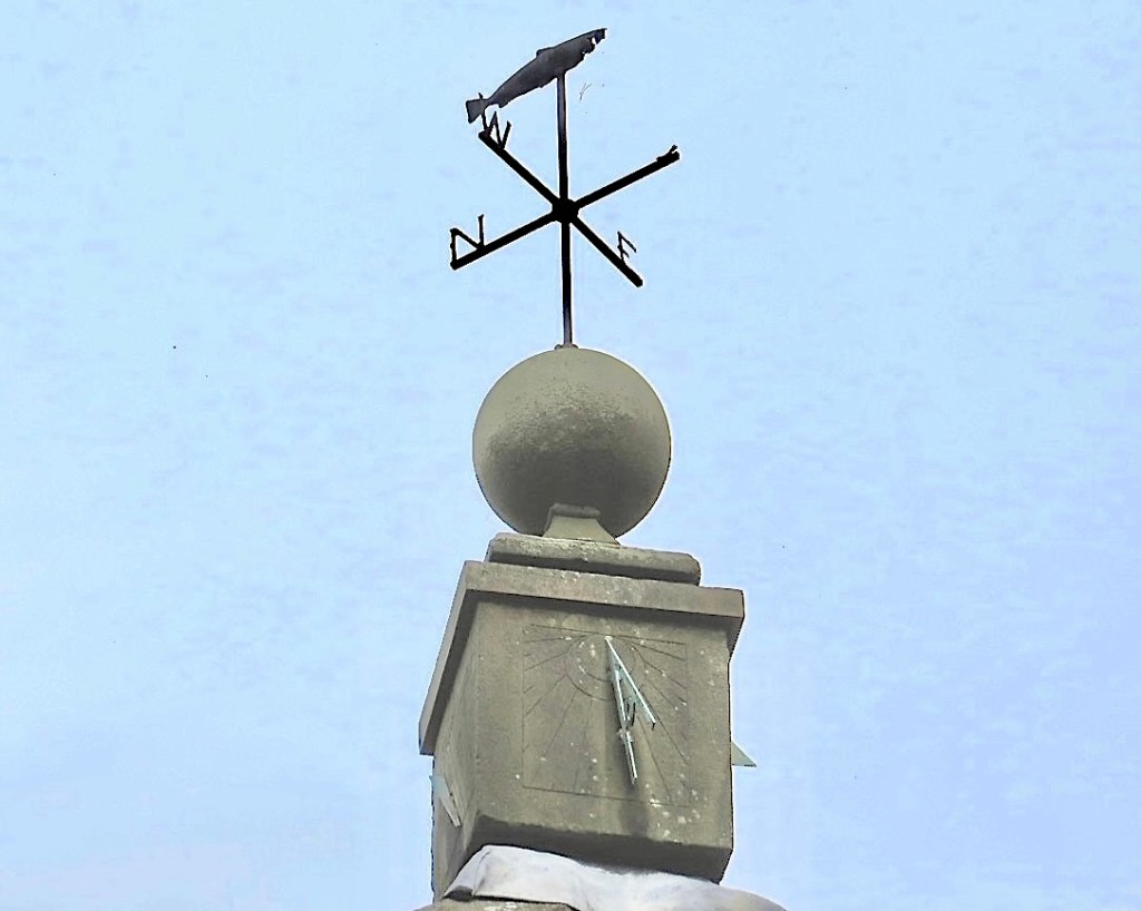 The dial is fixed to the apex of the hut’s roof. It is surmounted by a round finial, then a weather vane, and – a final flourish – a trout.