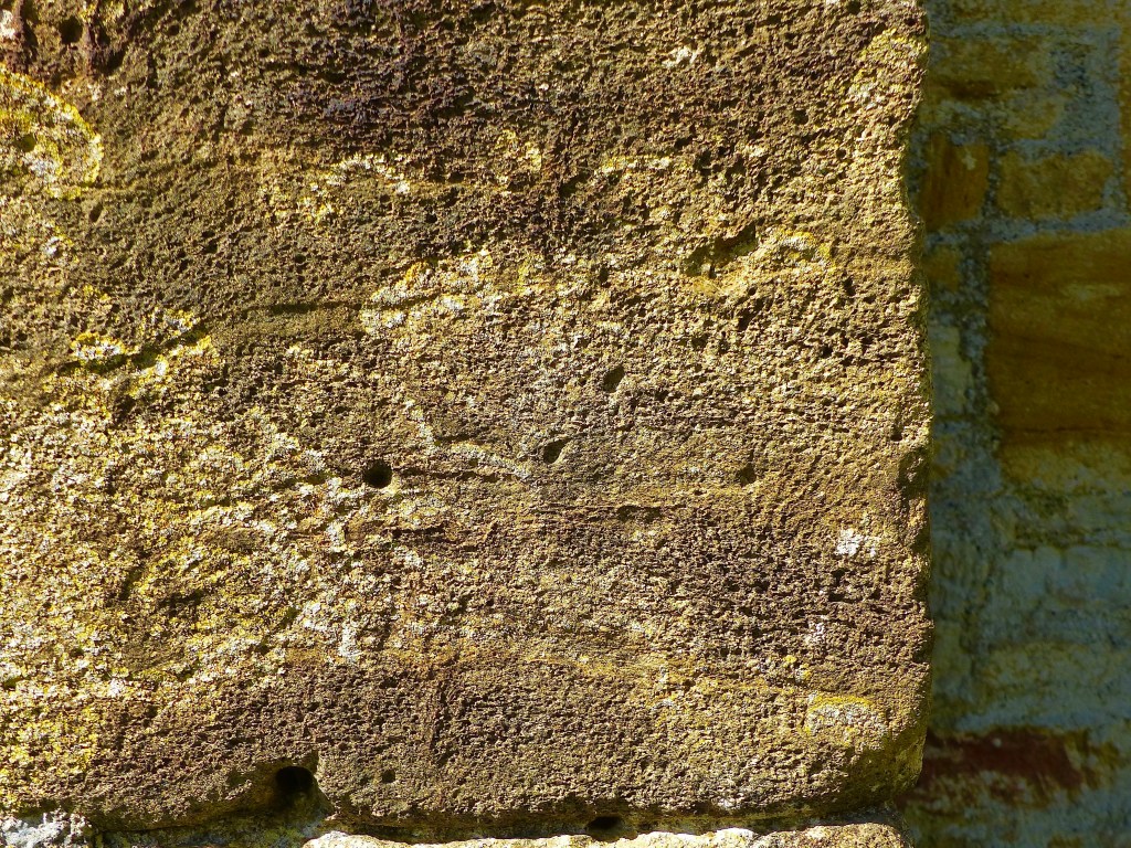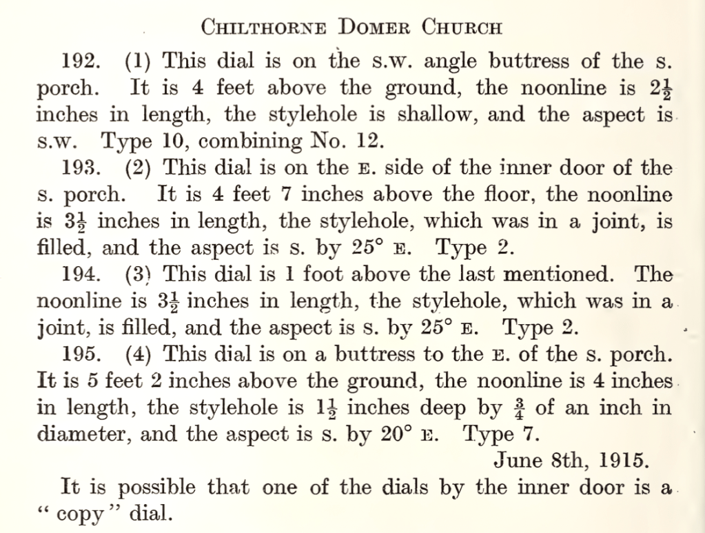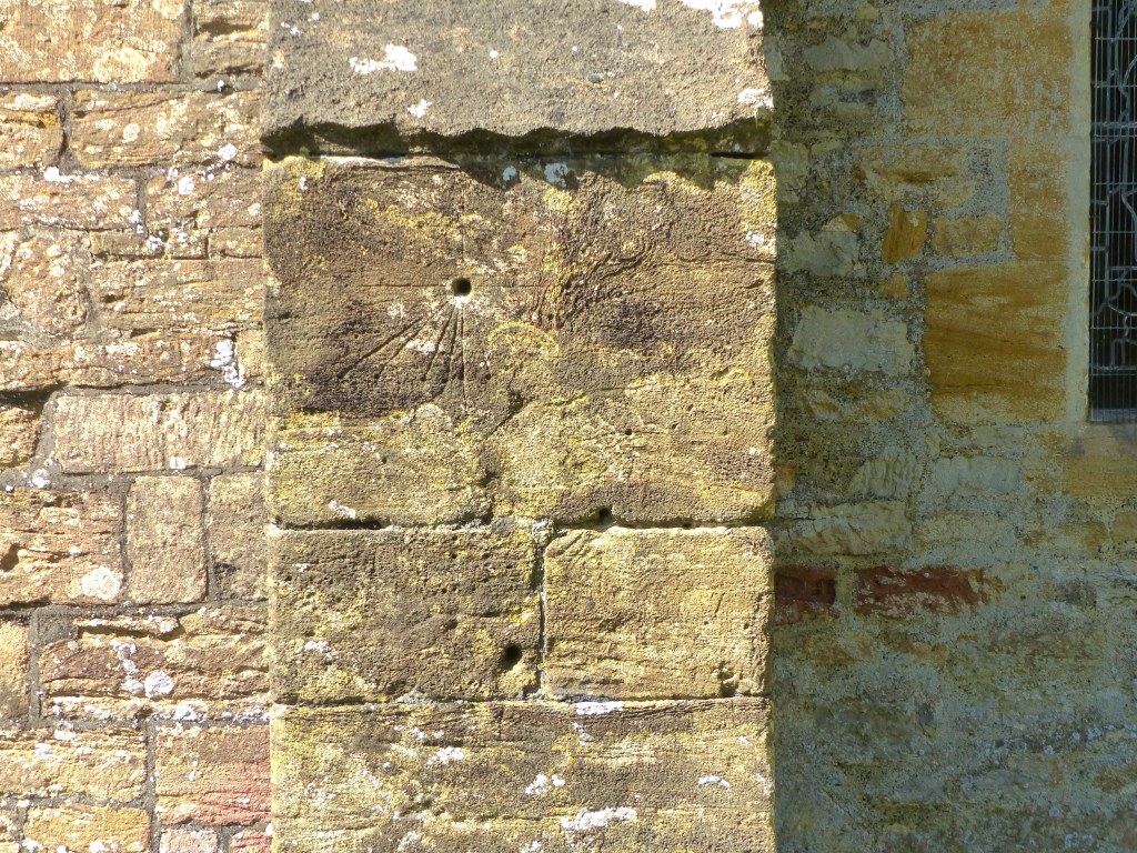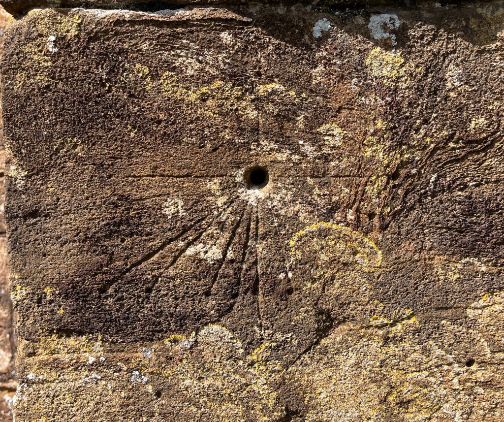 DEH visited St Mary in 1915 and recorded 4 dials (1 – 4 below). 2 of these are within the porch on the R jamb of the original doorway. There are at least 2 other certain dials and a couple of less convincing candidates