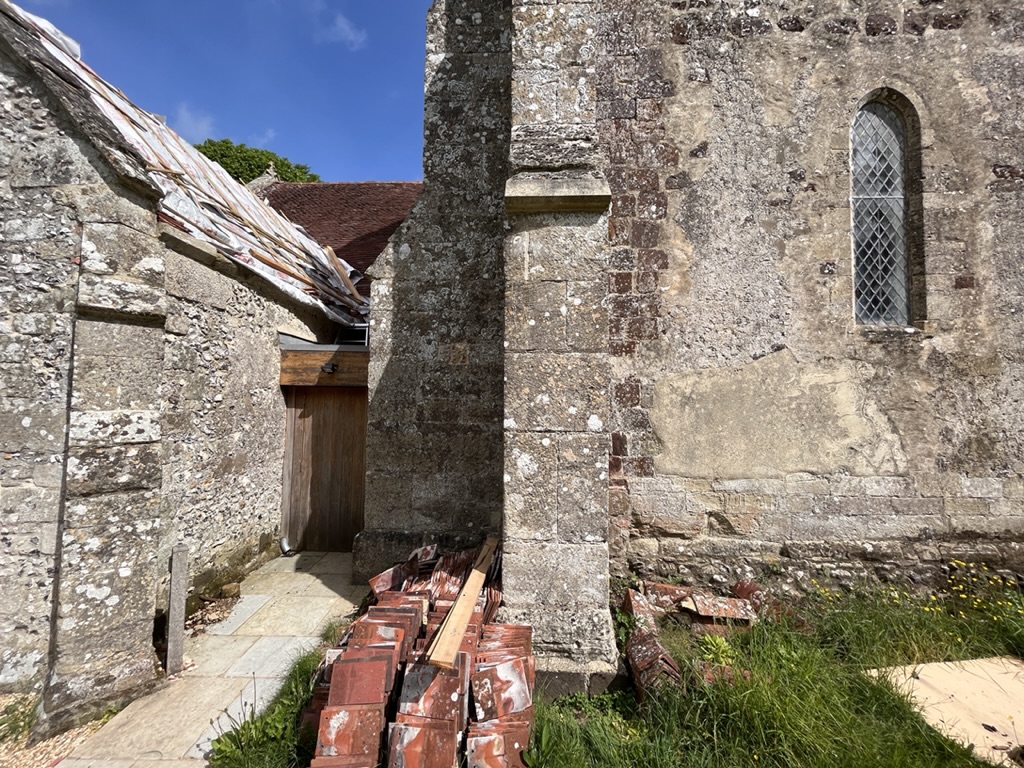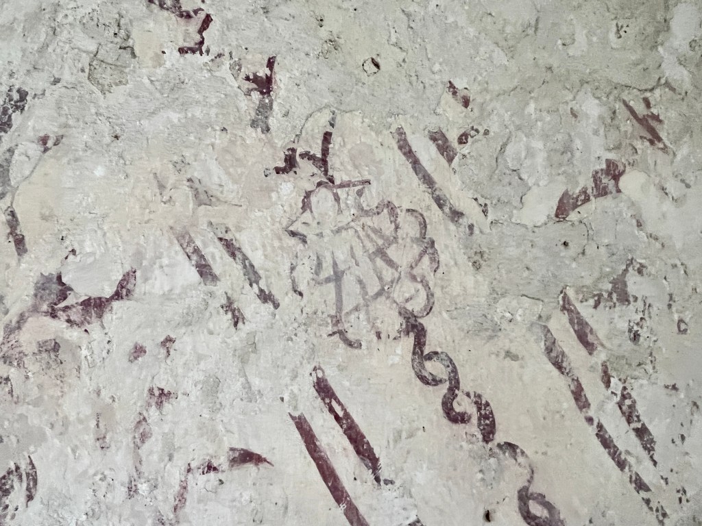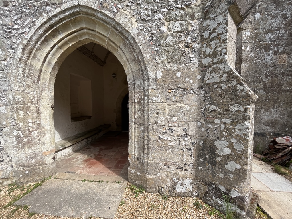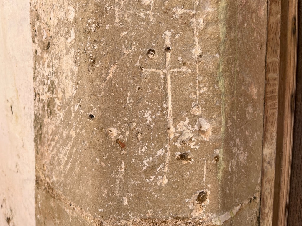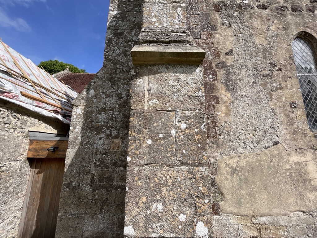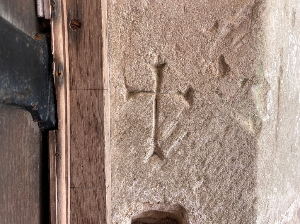 Within the S porch (added C15) the area around the original door has much medieval graffiti. St George was a church of pilgrimage, and inside there are pilgrim scallops incorporated in the fine wall-painting fragments. Both outside and inside the church, there are many crosses cut into the stone. Some may also be apotropaic in intention; some may be event marks (the porch is ideal for welcoming a new incumbent or a marriage).