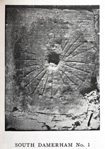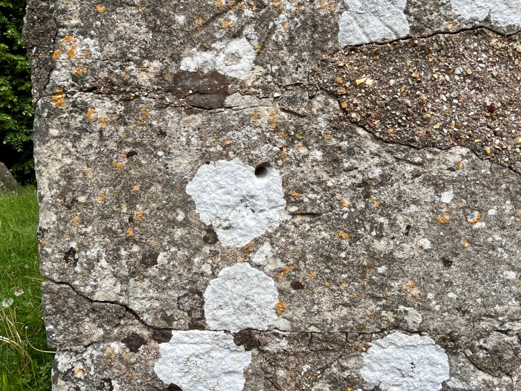 One intriguing feature of this dial is the mystery of the missing gnomon. In 2007 a contributor to the Geograph project, Trish Steel, uploaded a photo of the dial. It has a gnomon set into cracked mortar (unsurprising if it fell out). To an amateur it looks as if it may not have been in the right place anyway – too low? I wonder when it was first installed? It’s a very simple wedge of iron, perhaps inserted when the crack was originally repaired.