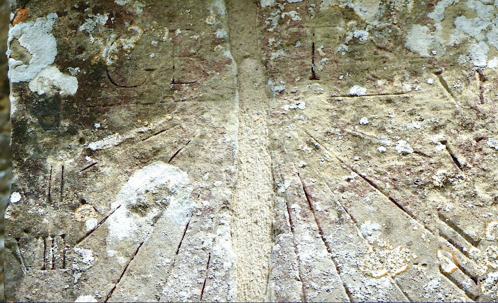 SW buttress of nave. Gnomon hole in the mortar line, from which 11 lines fan out below the horizontal. The design has been rearranged over the years, with the LR quadrant damaged and repaired without recutting the lines onto the cement.