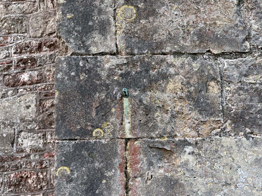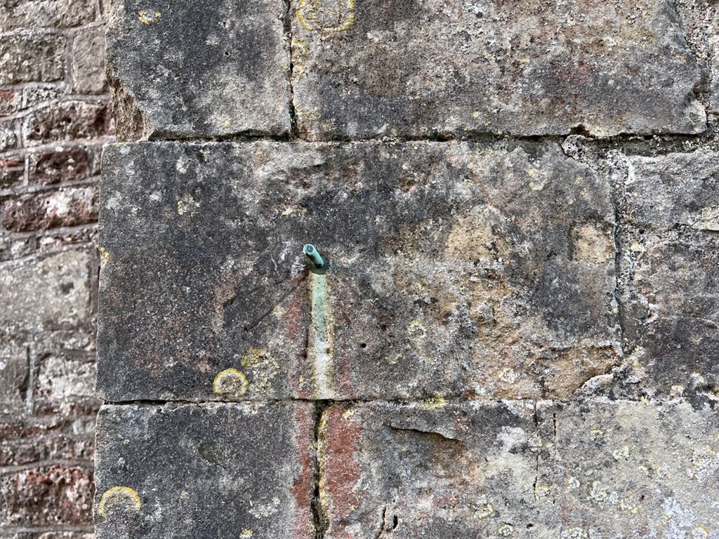 Dial 1 is located at SW corner of the nave, high up (7′) on a quoin stone. DEH noted The Mass line in this dial is sharp and distinct, and made at a different time from the other lines. He makes no comment on the design. There are 6 lines each with a terminal pock, with hints of a couple more. DEH makes no mention of a gnomon, but with his usual thoroughness measured the depth of the hole. It is certain, therefore, that the existing (copper?) rod was inserted relatively recently.