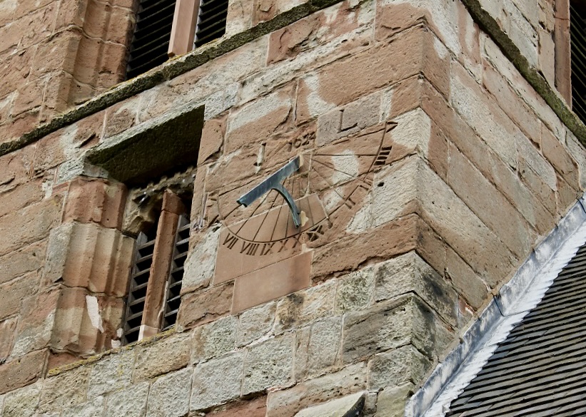 The vertical dial is high up on the S side of the tower, a semicircle with Roman numerals, with the date 1624 and on either side of it the letters J and L. The date may fit with work carried out on the upper stage of tower in C17. As can be seen, there has been good repair work on the dial, so that it is observably both ancient and modern.