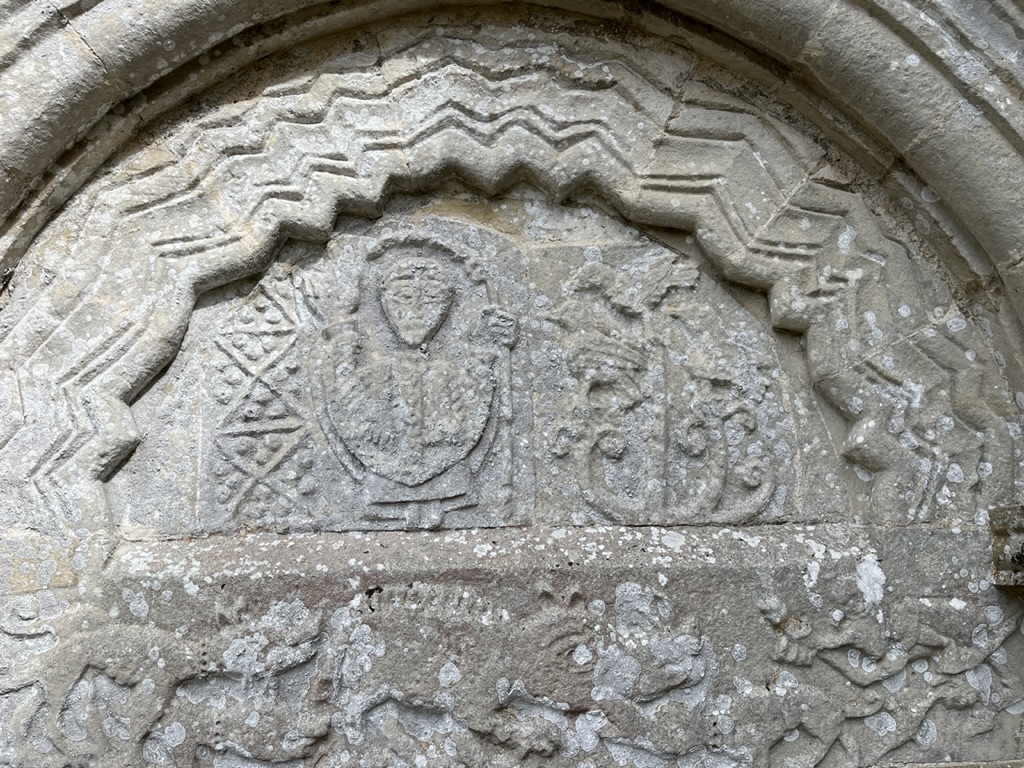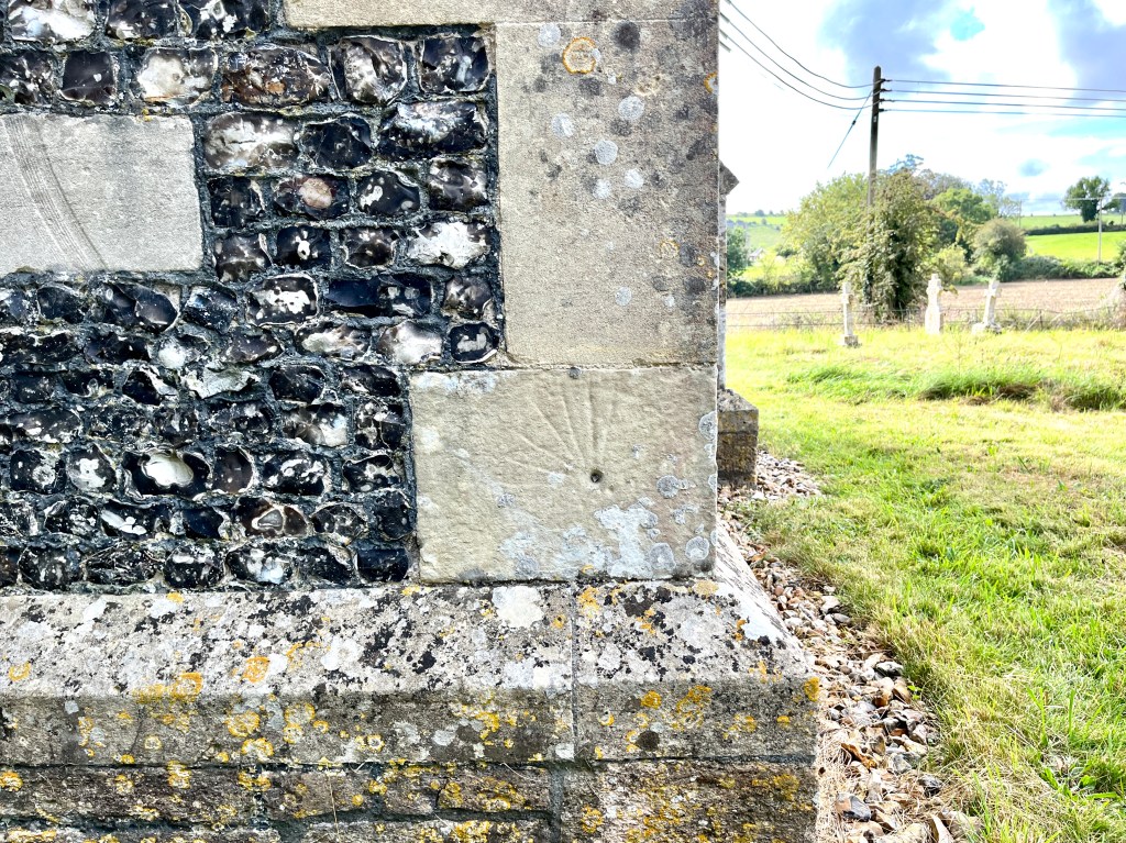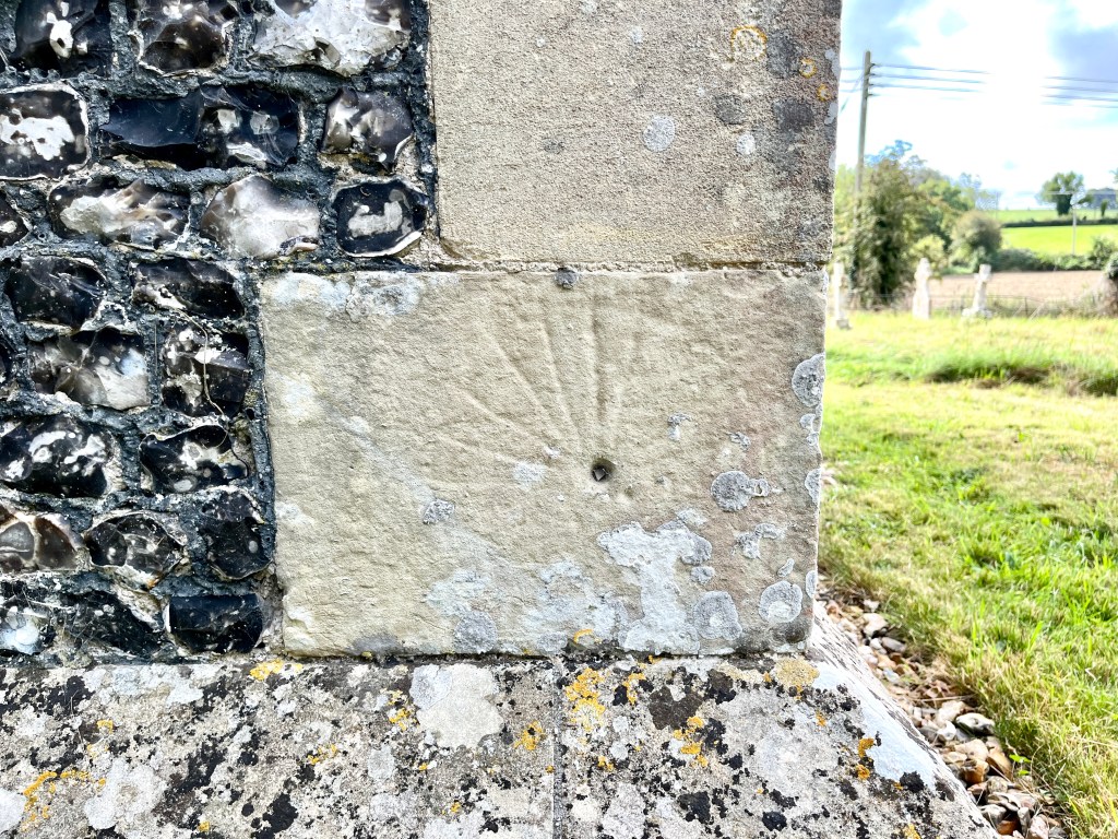 GRADE II* † C12 – C15; Wyatt restoration 1864. Myra (as Church Notice Board; OBS); also, Mira. Charming small church in Little Langford (not nearby Steeple Langford as mostly given in refs) down a side road off a side road. A pleasure to visit and of considerable interest. C12 font bowl; a fine tympanum with symbolic carvings; a large hexfoil re-sited high up on E end N quoin; and – most relevant here – an excellent scratch dial re-sited as quoin stone low down W end of N side (cf Litlington E Sx). 51.1288 / -1.933 / SU047366