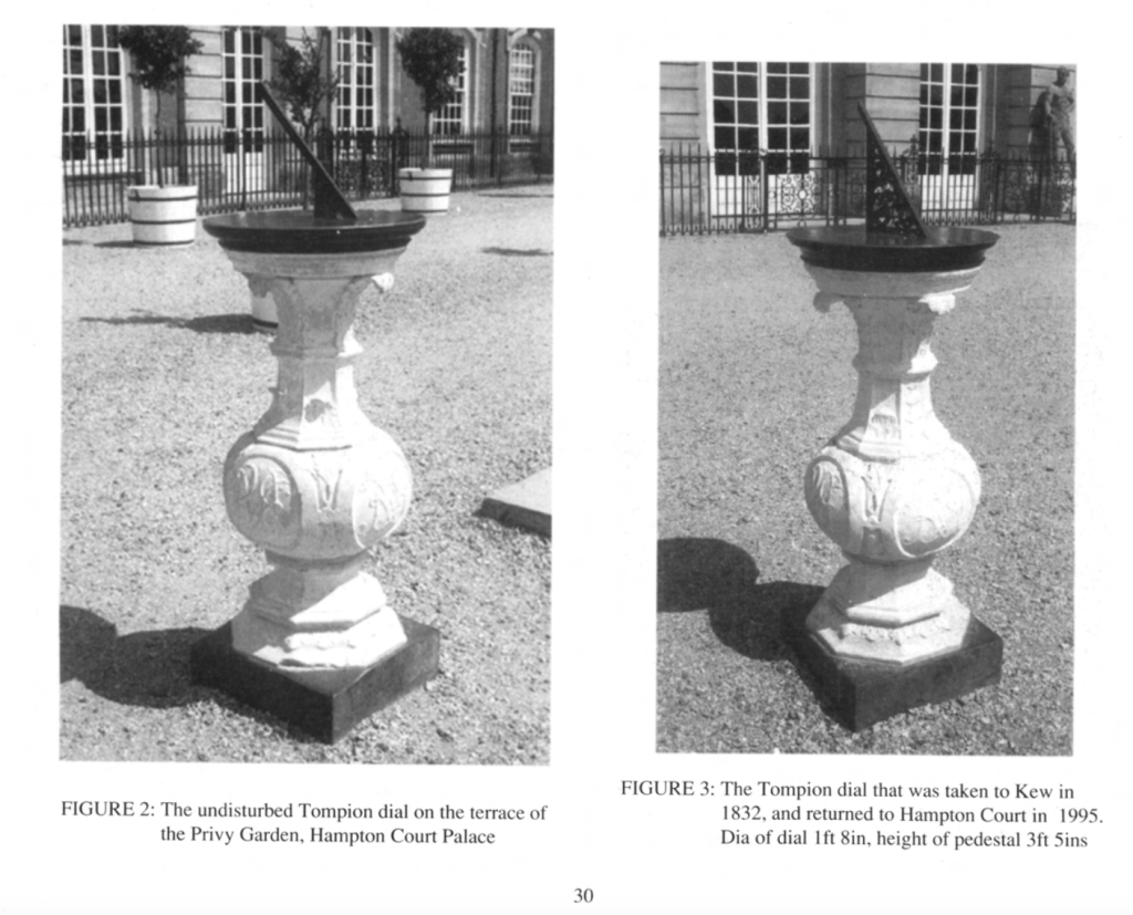 This famous Tompion dial in the Privy Garden at Hampton Court is one of a pair, the other being transferred in due course to Kew Gardens. The BSS Bulletin Jan 1997 includes side-by-side photos of both. The dial that stayed in situ, featured here, being on the left. The other dial was transferred to Kew in 1832 and not restored to Hampton Court until 1995.
