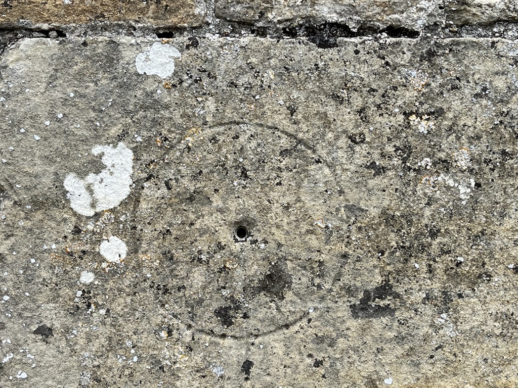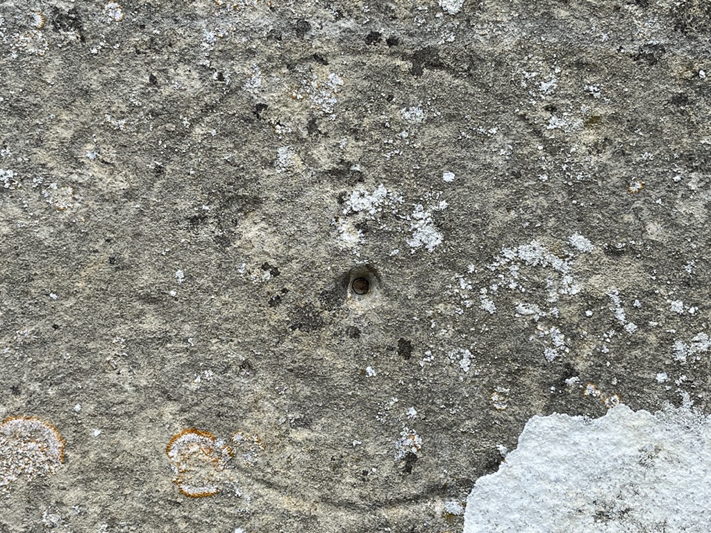 The dial’s circle is clear and the gnomon hole is large (with signs of recent enlargement). Apart from that only the faintest traces of lines remain, presumably lightly cut initially and eroded over the centuries.