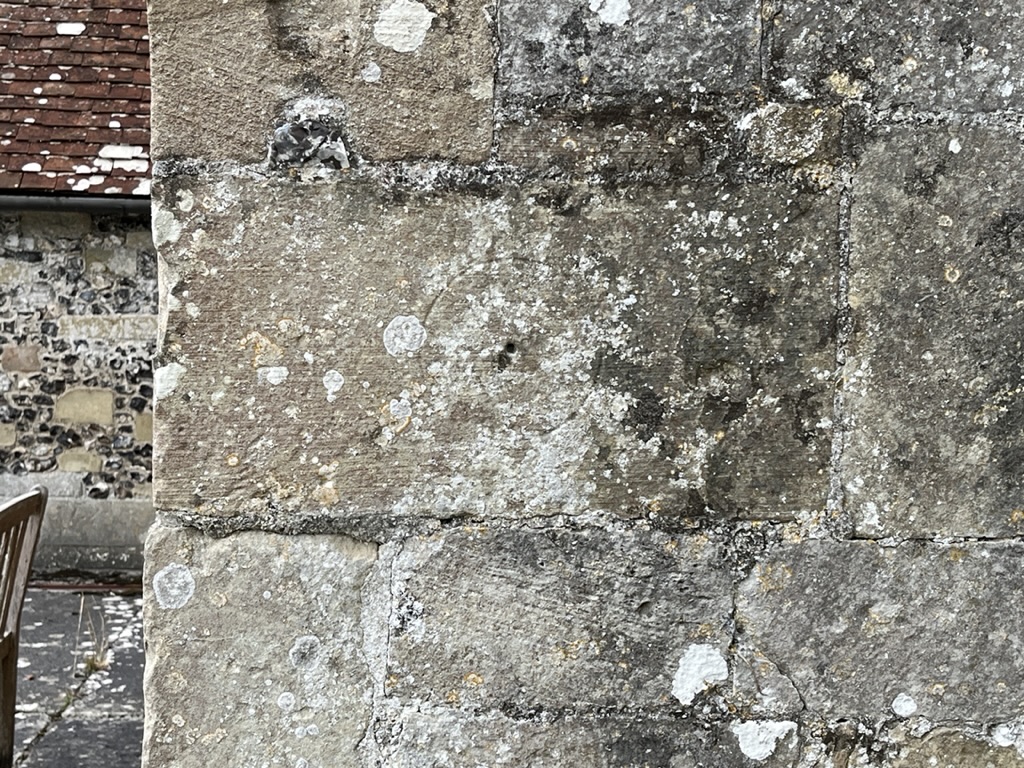 A partially obliterated circle; a gnomon hole; hints of 3 pocks LRQ. Perhaps we can deduce that this was the first of the dials. Of course, even a stick in the centre hole would give a fair idea of the time of day to the passing parishioner.