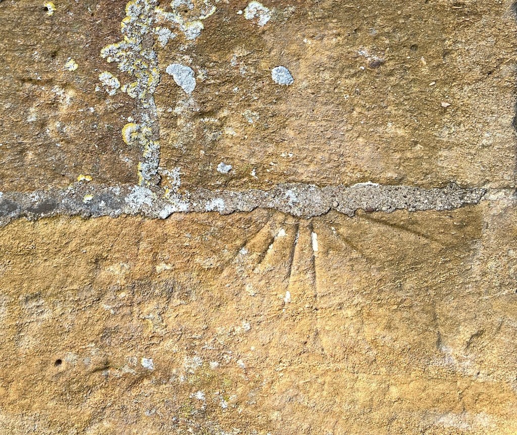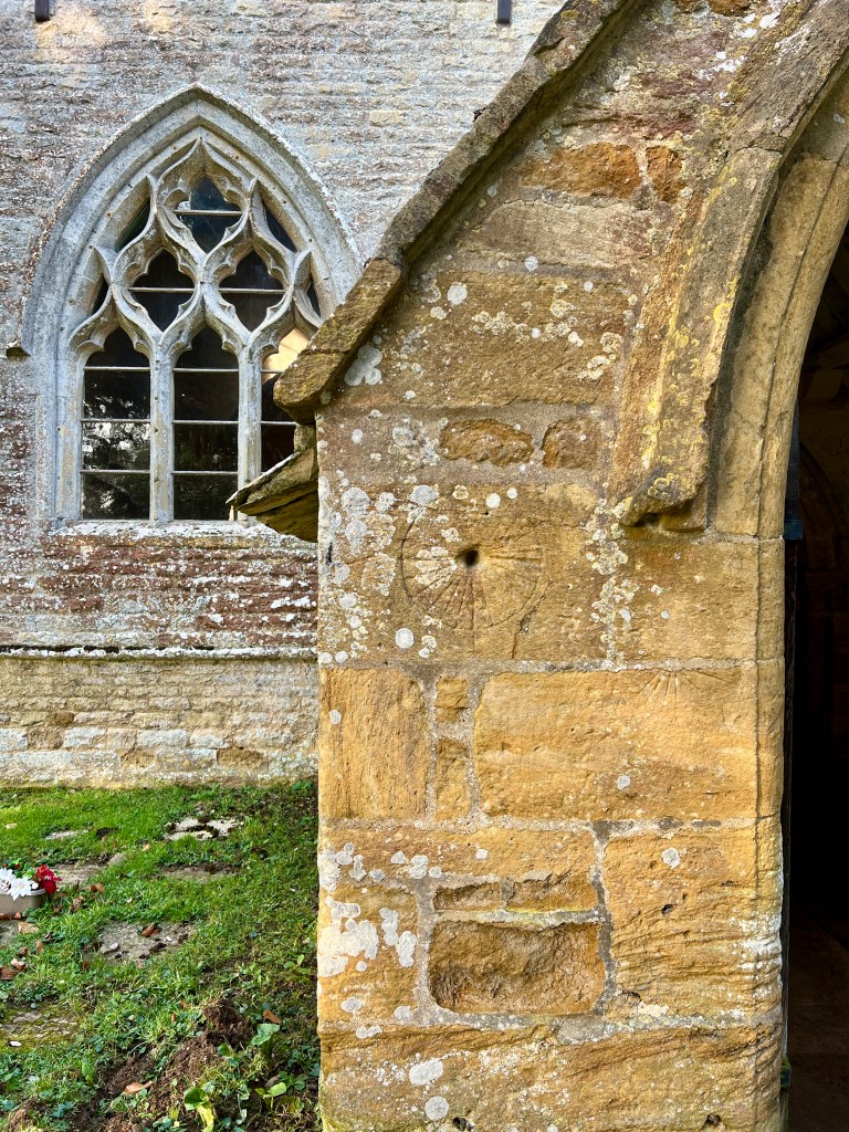 DIAL 1 has a sizable gnomon hole, enlarged over tIme. The noon line is emphasised by being cut beyond the circle boundary; it also marks Sext. The emphatic horizontal incision RHS suggests that sunset (nocturns; compline) was a significant hour for observance. There are 4, possibly 5, faint lines URQ – probably rustic knife / nail scratchings rather than part of the original dial.