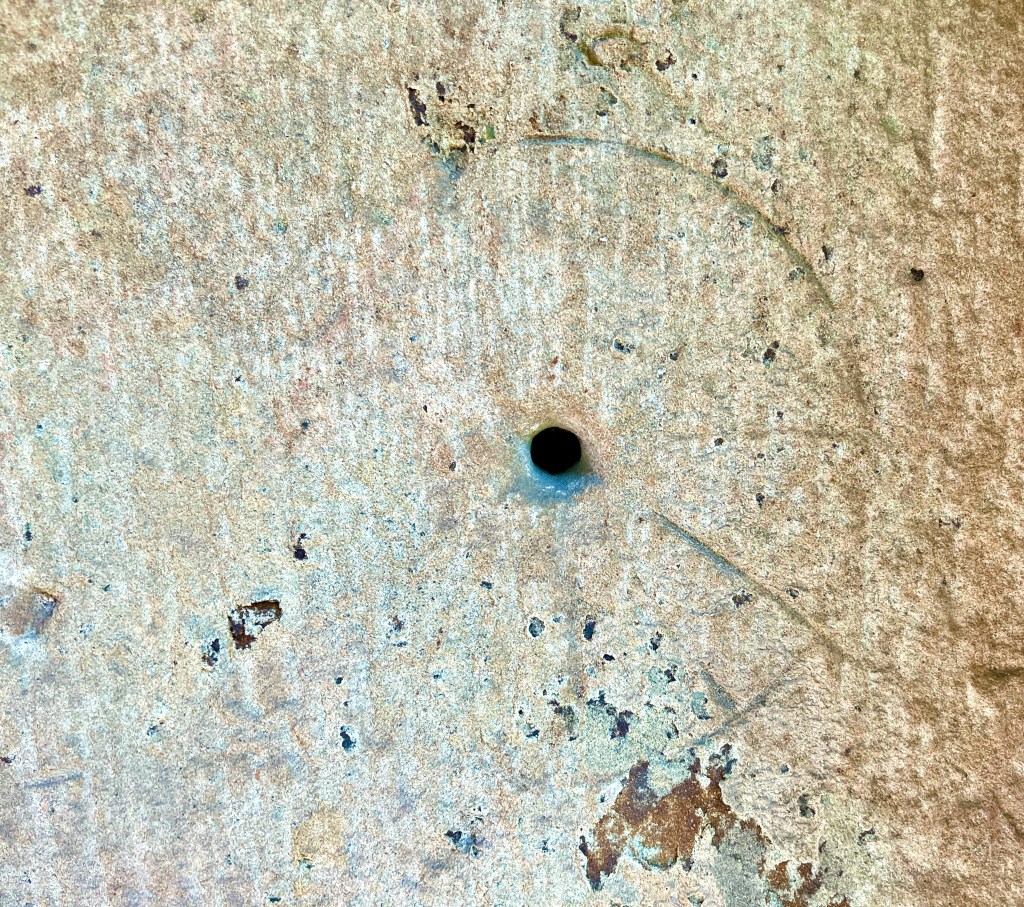 The dial is within the porch to the right of the doorway. It is encircled. The whole left half is now very faint. The clear straight line RHS at 3 extends beyond the circumference, suggesting that mid-afternoon marked the significant time of the day. Above it, at 6, a scratched rustic ‘line’. Just below there’s a near-obliterated straight line. With some imagination, there may even be a trace (see close-up) of a noon line. At some stage a copper rod has been used as a gnomon, with the blue coloration spreading below.