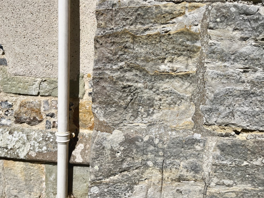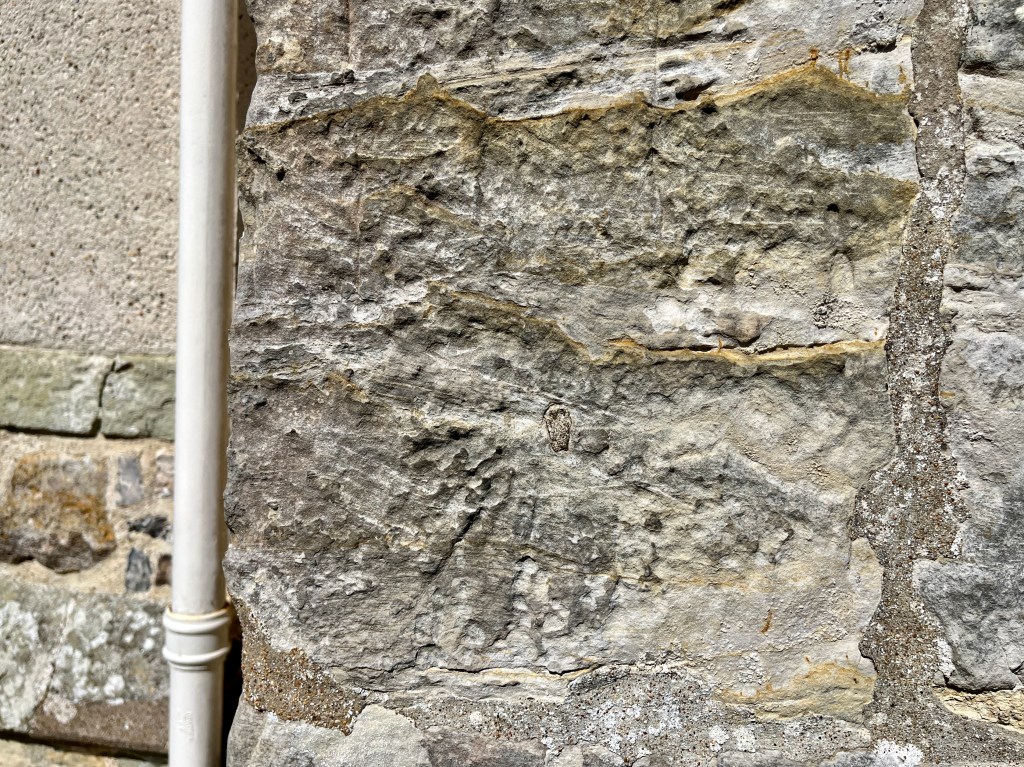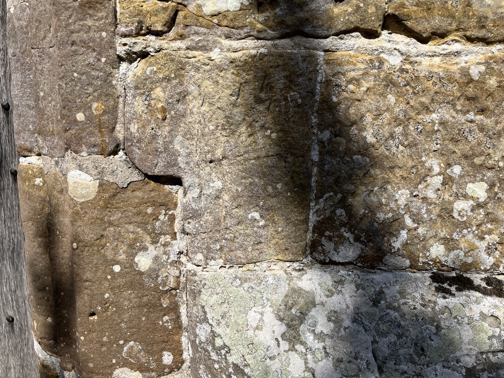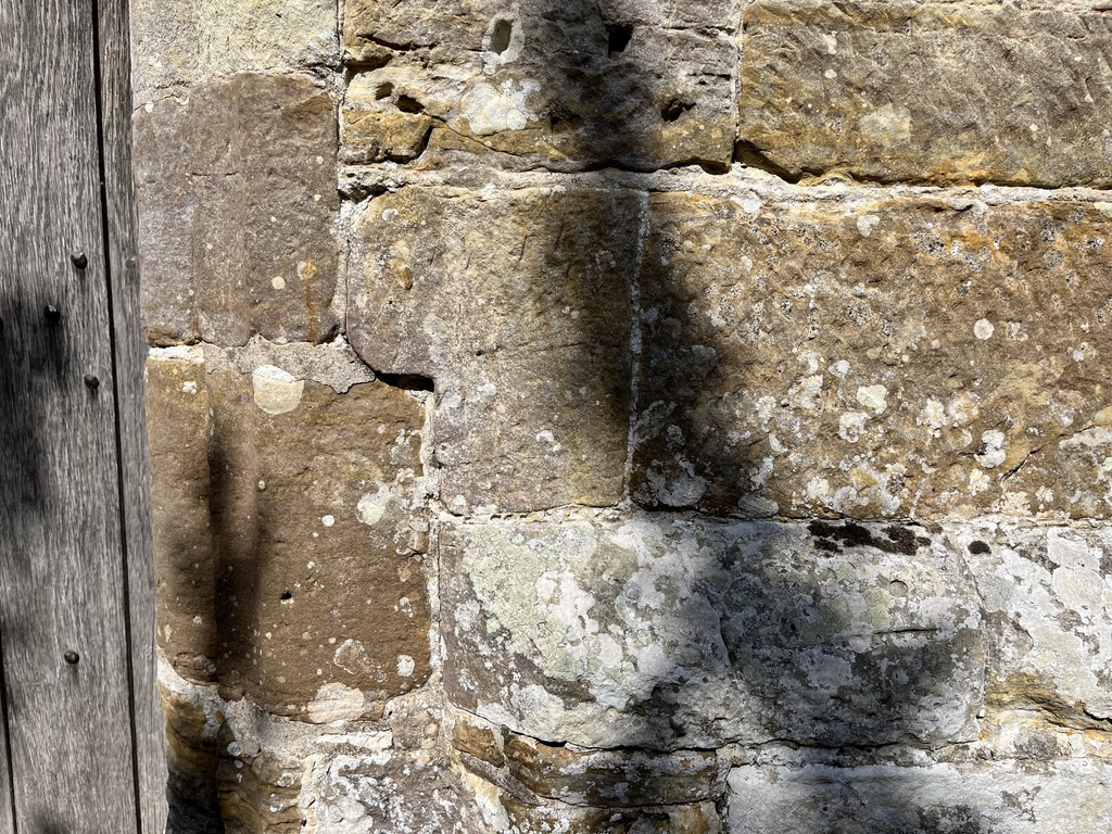 The church is said to have 3 dials, though I could only find 2 definite ones. The first is very rough, with ?2 lines dropping down from a plugged hole, and some scrapes around the area. It’s hard to see how it marked the course of the day effectively. The hardness of the stone may explain it.