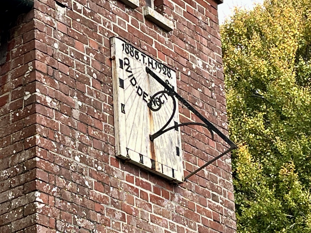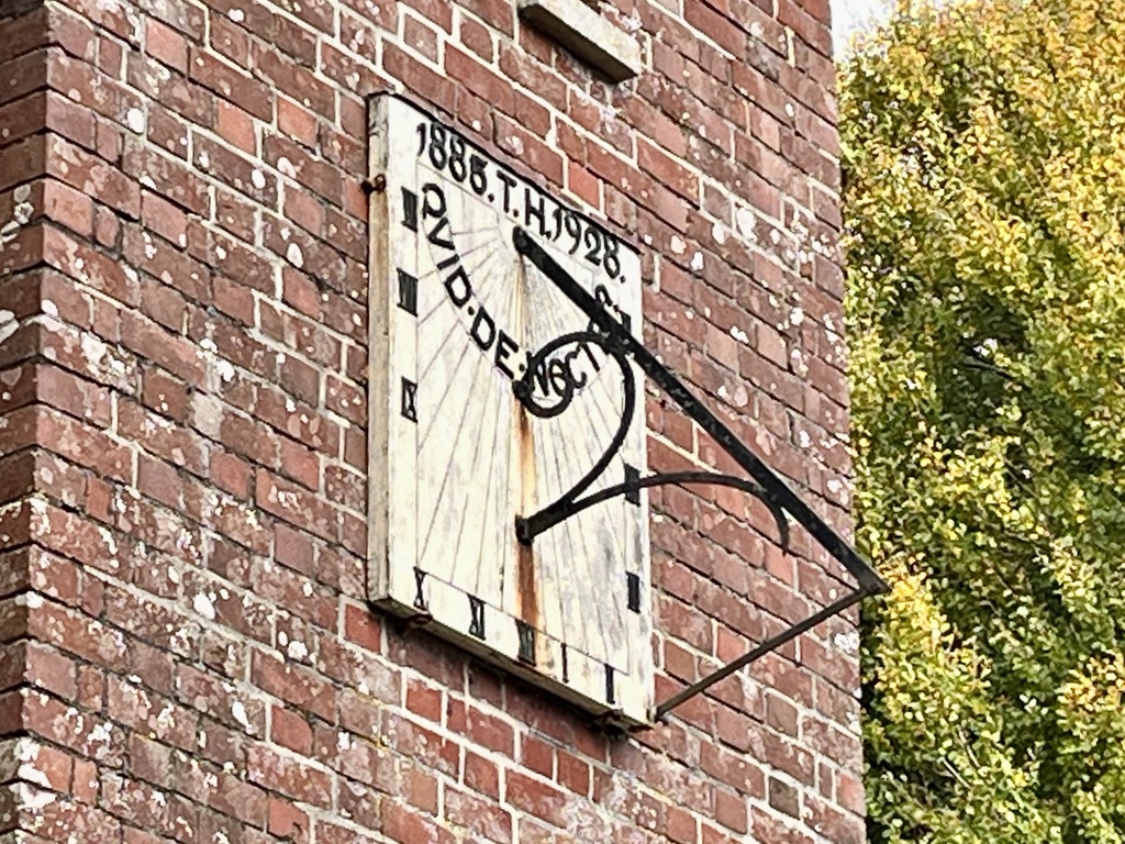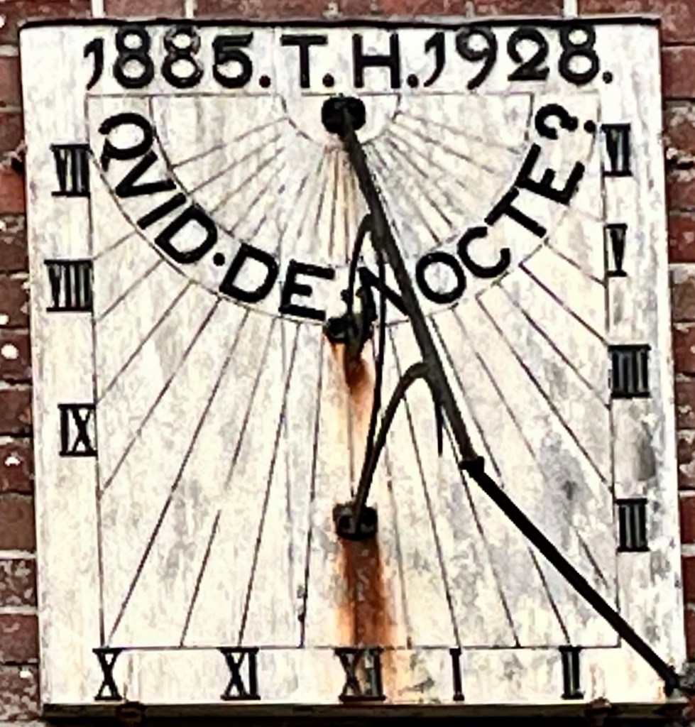 High up on the east tower, the dial is a good example of a sundial that (besides its primary use) acts as a memorial, and tastefully reflects the significance of the dedicatee. It is also very visible and easy to read at a distance. The lightly ornamental gnomon is moored at the bottom right corner as you face the dial. The style is simple, with 12 hours marked from 7.00am to 6.00pm and 24 radials to record half hours. The dial plate is white-painted wood. Overall the dial is in poor condition, but I gather that there are plans to carry out complete restoration during 2026.