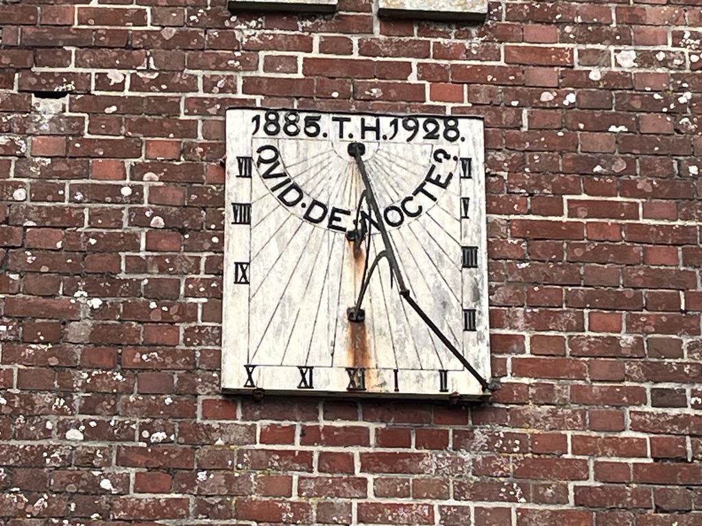Literally, ‘WHAT OF THE NIGHT ?’ Interrogative sundials are relatively unusual, and I am unsure when the inclusion of question-marks began. The simplest reply might be ‘NIHIL’ – the sun is asleep.