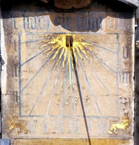 King’s College is one of the best-known Cambridge colleges, not least because of its pre-eminent choral music tradition. This fine dial is on the right side of the Chapel porch. The hour lines and numerals are painted in black directly onto the stone. The gnomon emerges through a golden sunburst, matched by two gold heraldic lions in the lower corners. The dial itself dates to 1733 (BSS) and the inscription J.C. 1578 on the face is a mystery: no specific association has been matched to it.