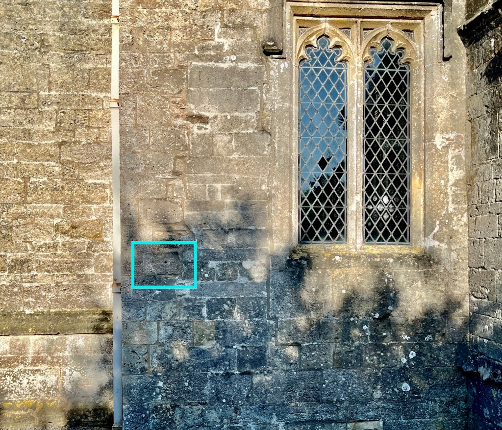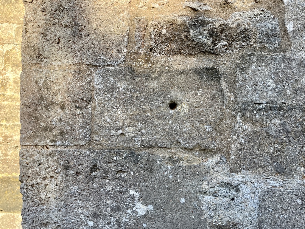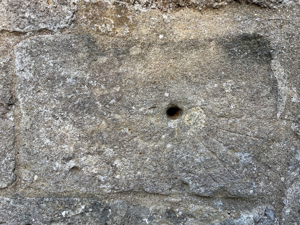 DEH recorded a single dial on W corner of S aisle. He noted a 2.5 inch deep gnomon hole and commented ‘…this dial is cut on soft red sandstone and has all 12 hour lines… many of them probably added to the original design’. More than 100 years later, only 9 are legible.