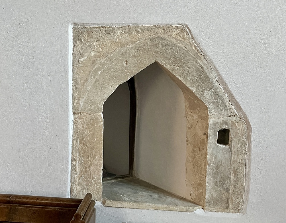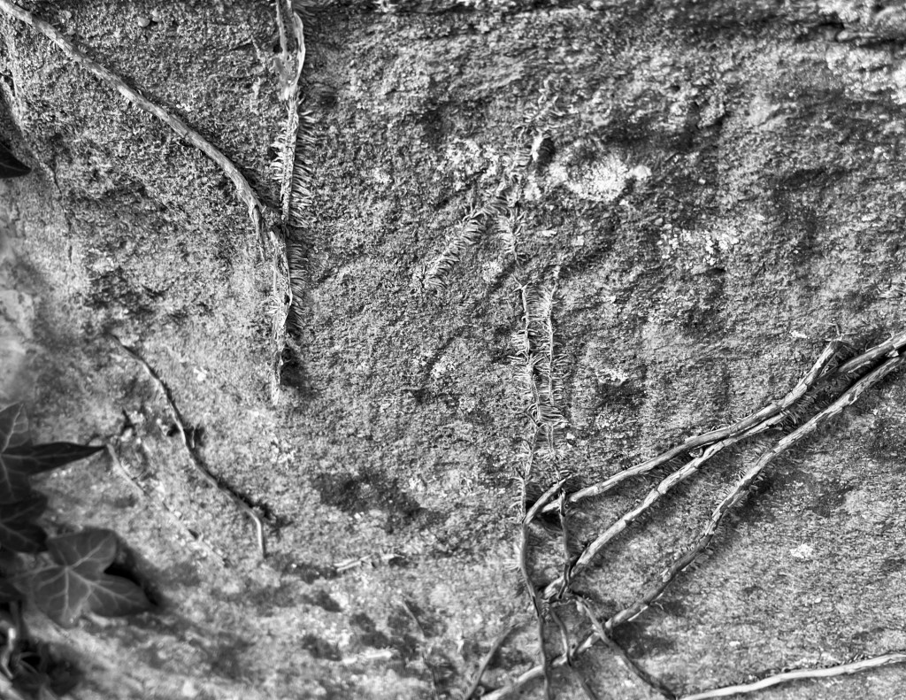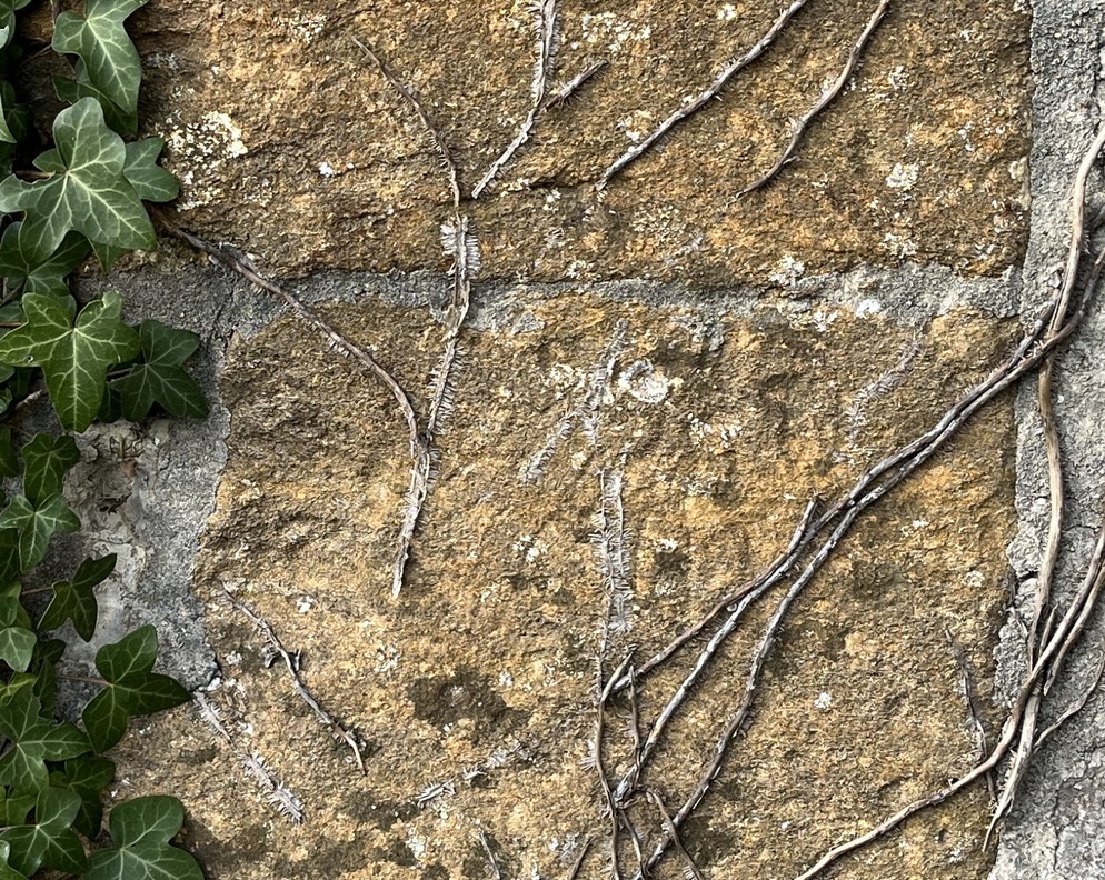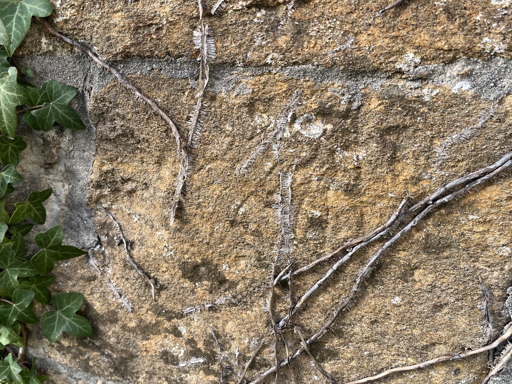 Eventually I found the dial, LHS amidst ivy both alive and dead. Its position close to ground level renders it useless for its purpose, yet it doesn’t seem to have been relocated. The ‘design’ consists of 4, perhaps 5, spidery radials descending untidily from the mortar line. It is 100+ years and a lot of ivy since DEH recorded the dial, and we can predict that it will soon be concealed by ivy, or eroded away.