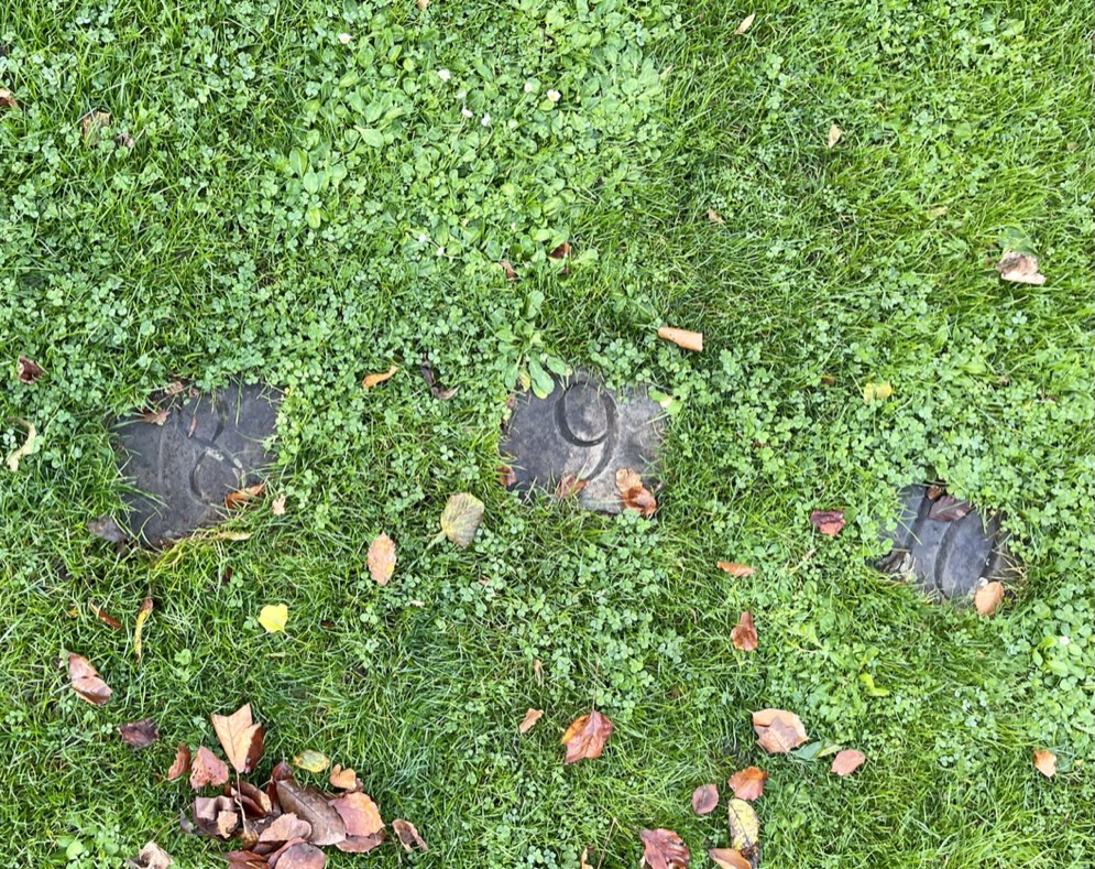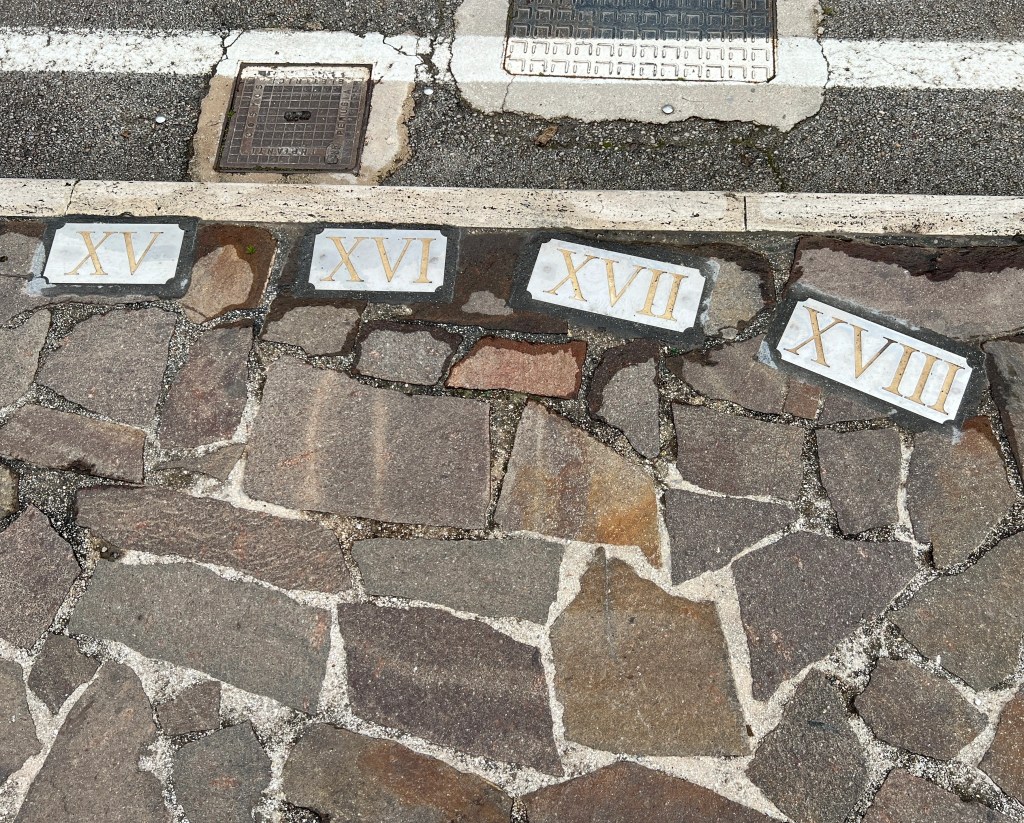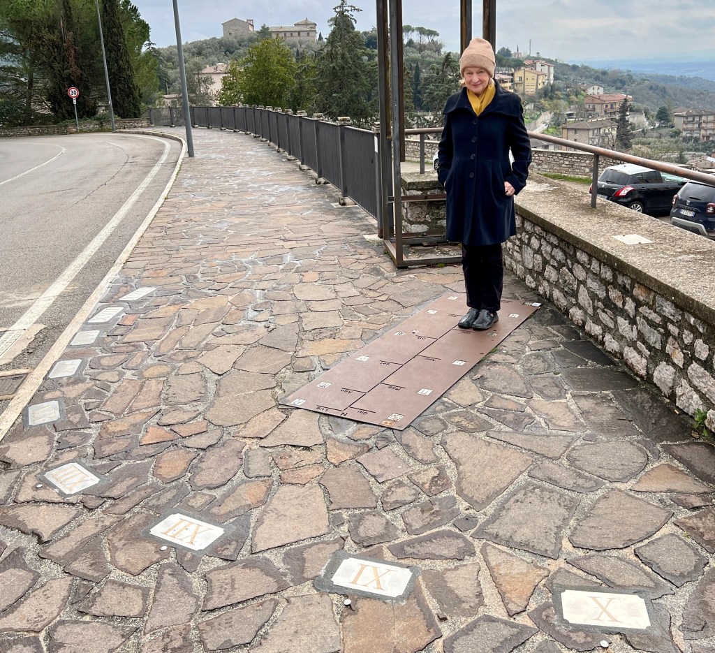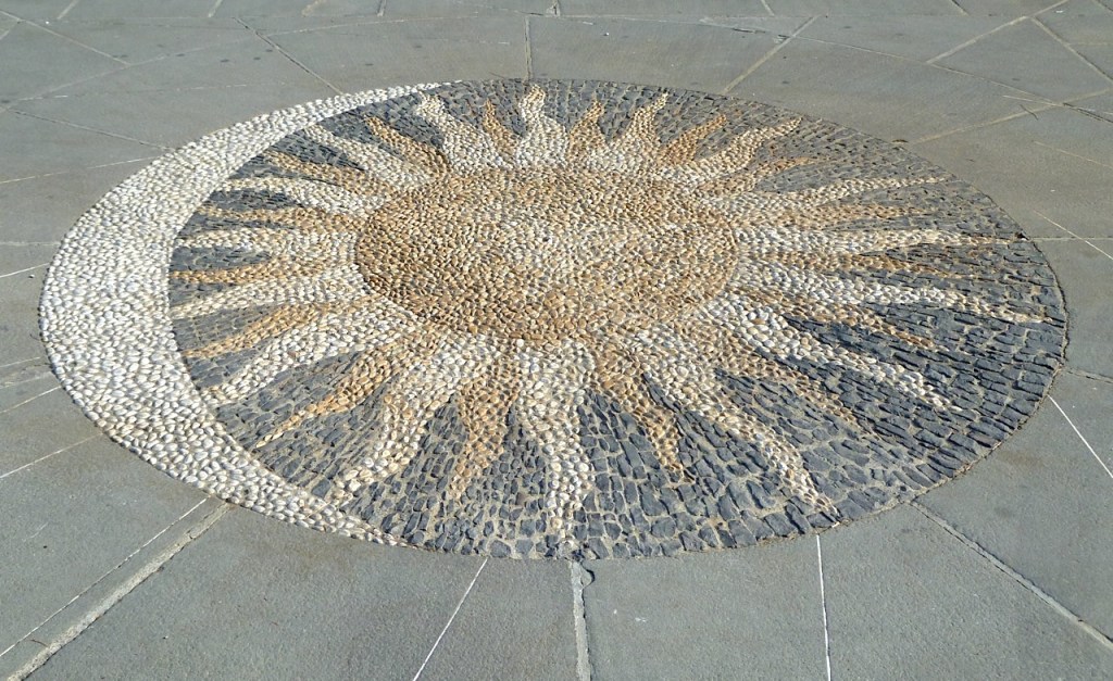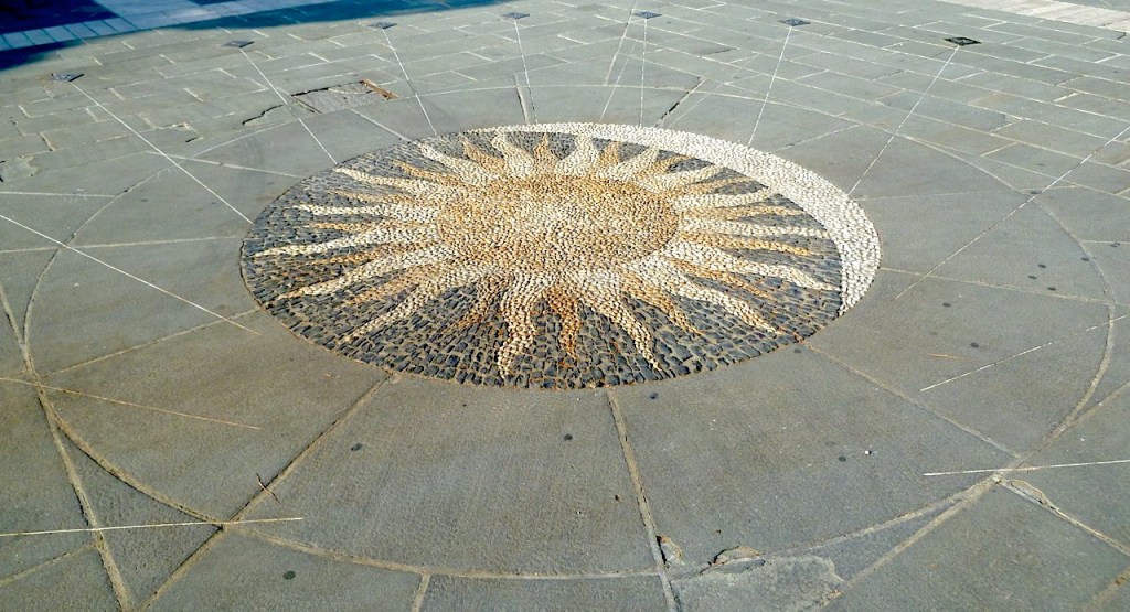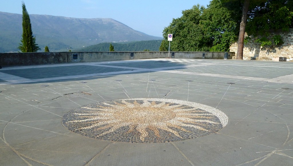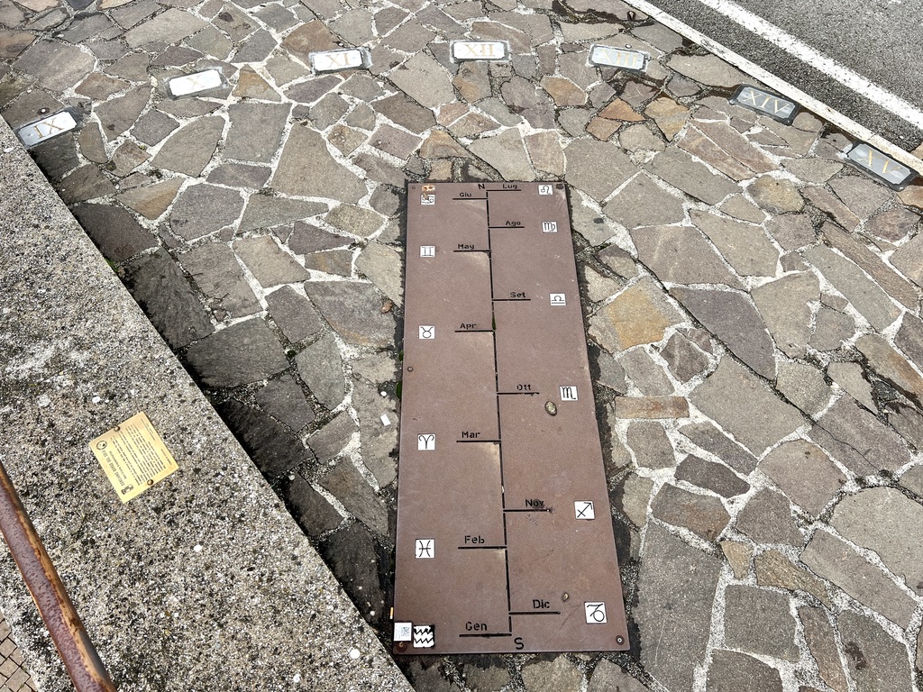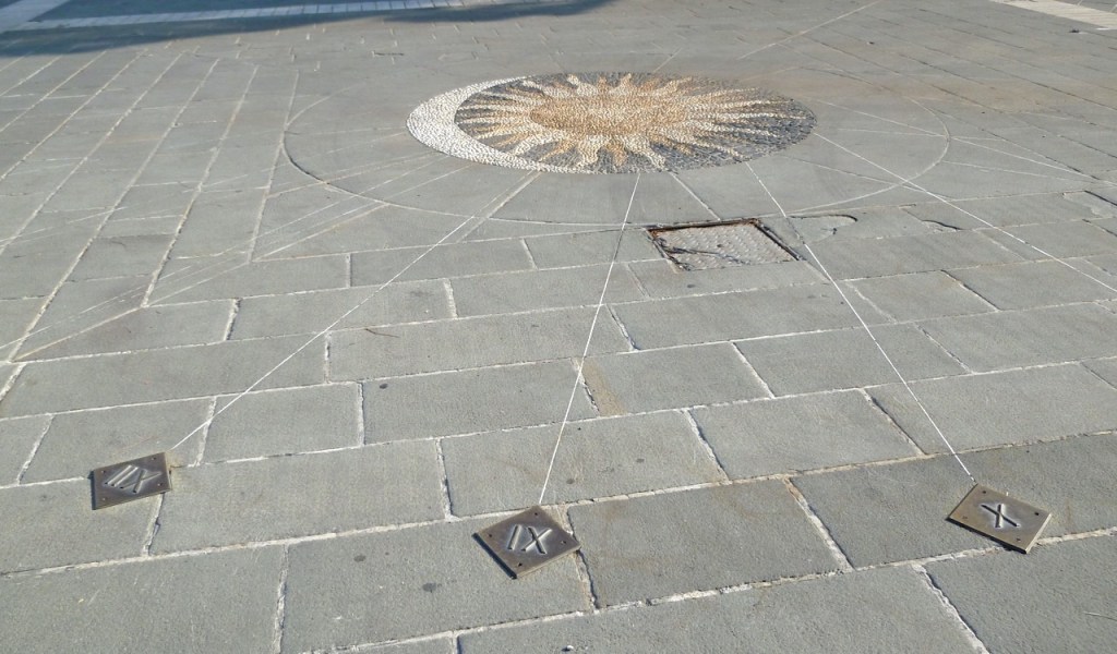The sundial takes up a substantial area of a large open piazza with a most attractive outlook. It consists of a central sun/moon stone mosaic with radiating ‘sight’ lines to small brass plates numbered from VI to XVIII (in fact number VI is missing, the rest are there). The gnomon is the person who stands at the centre of the sun. There are no buildings close enough to obstruct the sun’s light, so on a sunny or even a bright day, the time can be easily told at least approximately… were it not for the cars that are normally parked all over the square!