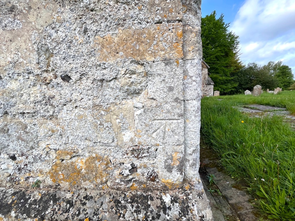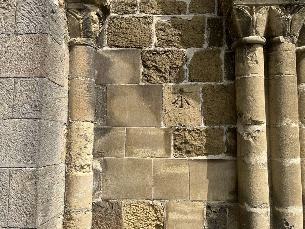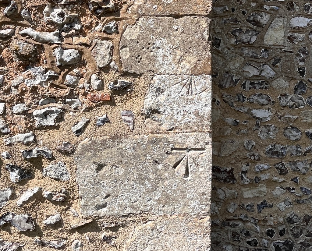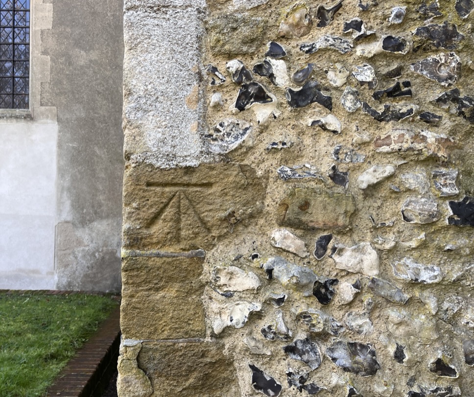 Modern marks on an ancient Surrey church that has at least 9 scratch dials
