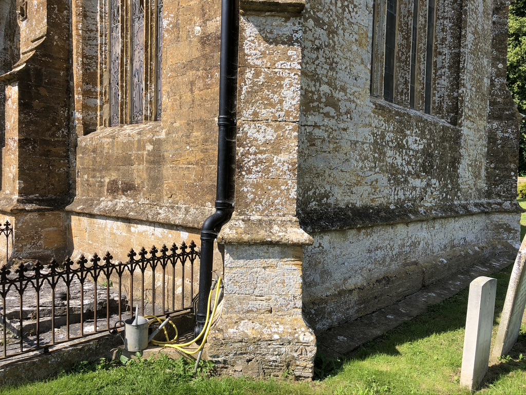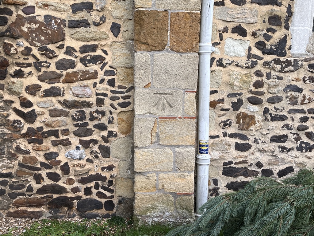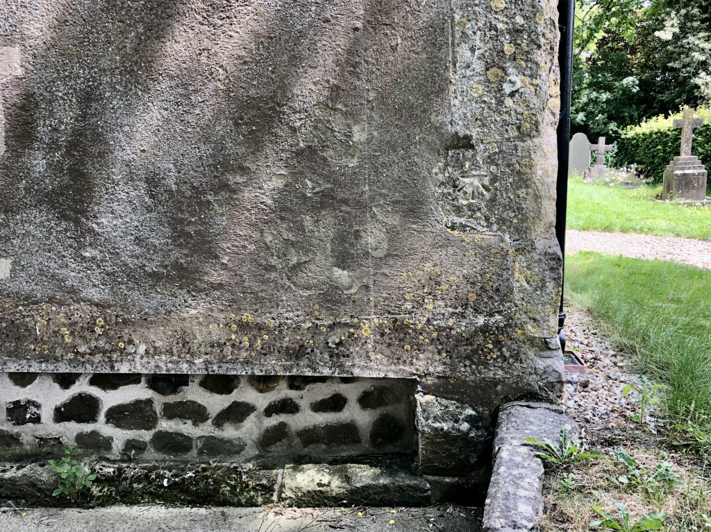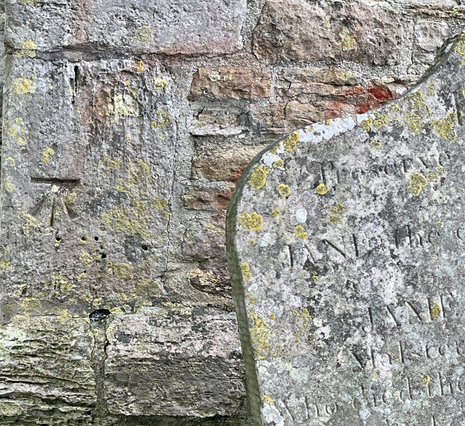 Modern marks on an ancient Surrey church that has at least 9 scratch dials