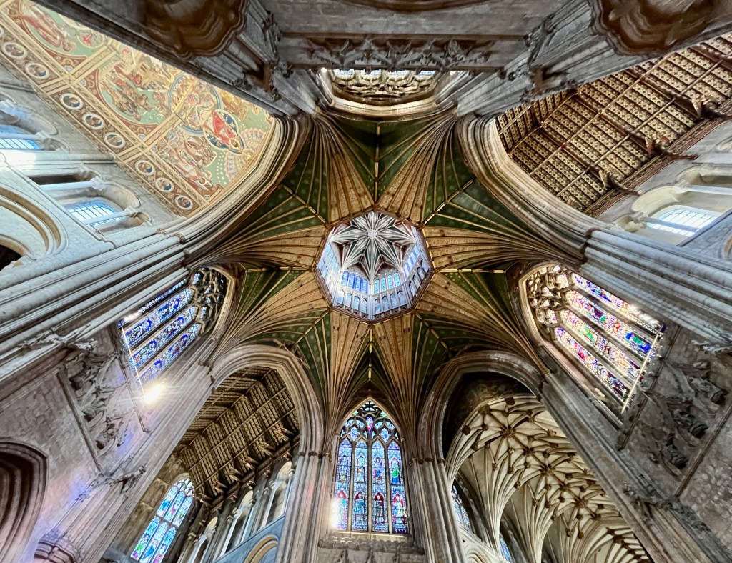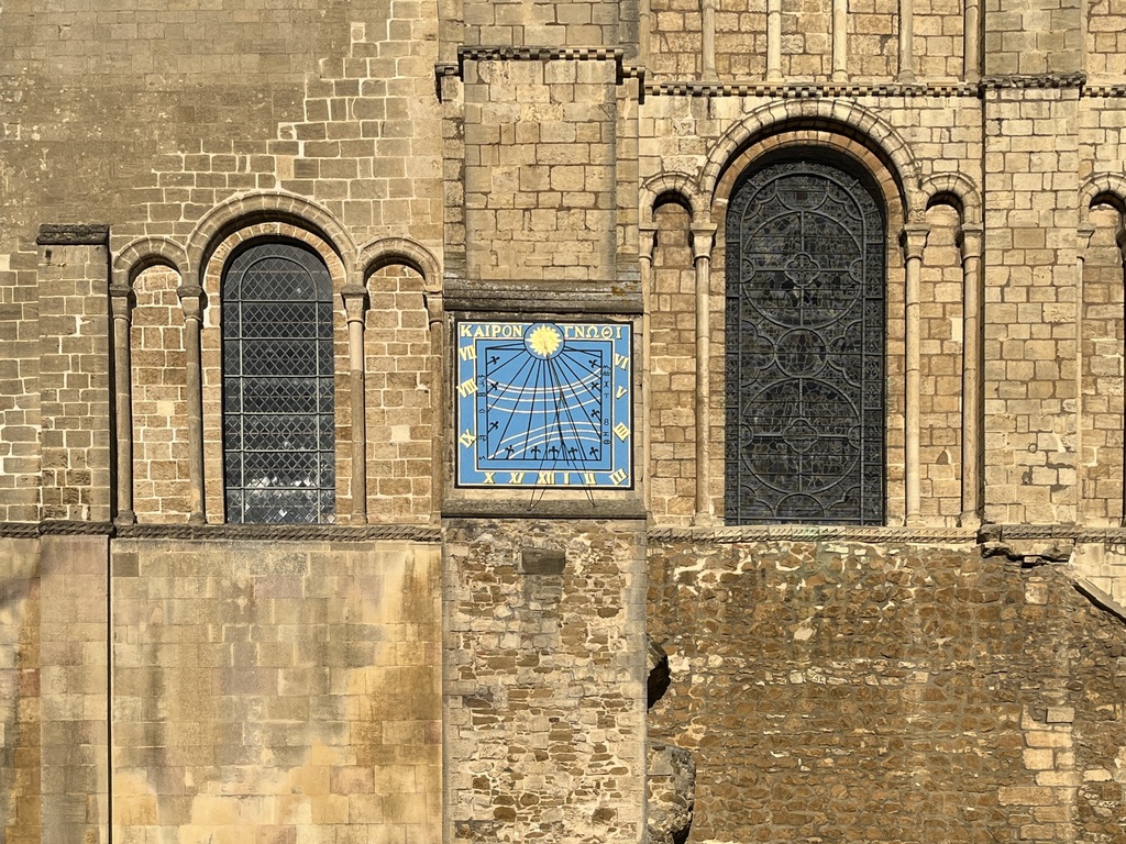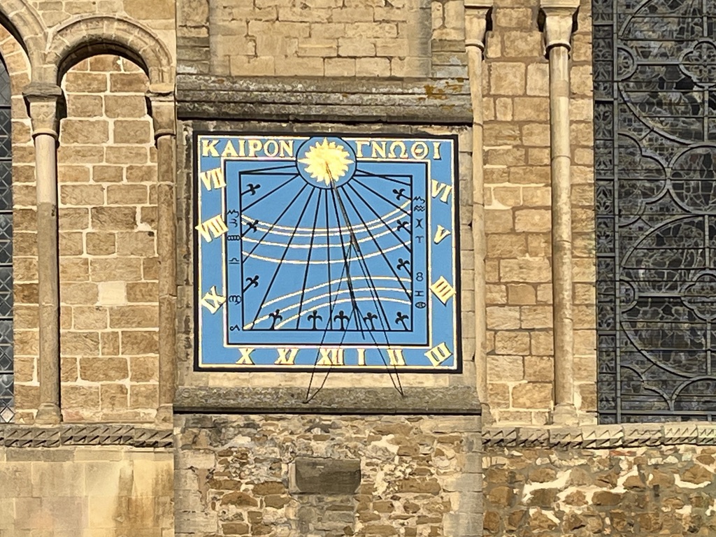 This project does not generally cover in detail the actual buildings on or near which dials are to be found. My header photo of the ethereal Octagon of the Cathedral will have to stand for the wonder of it all. The focus here is on the excellent vertical dial, high up and very legible, on the south-facing wall of the South Transept.
