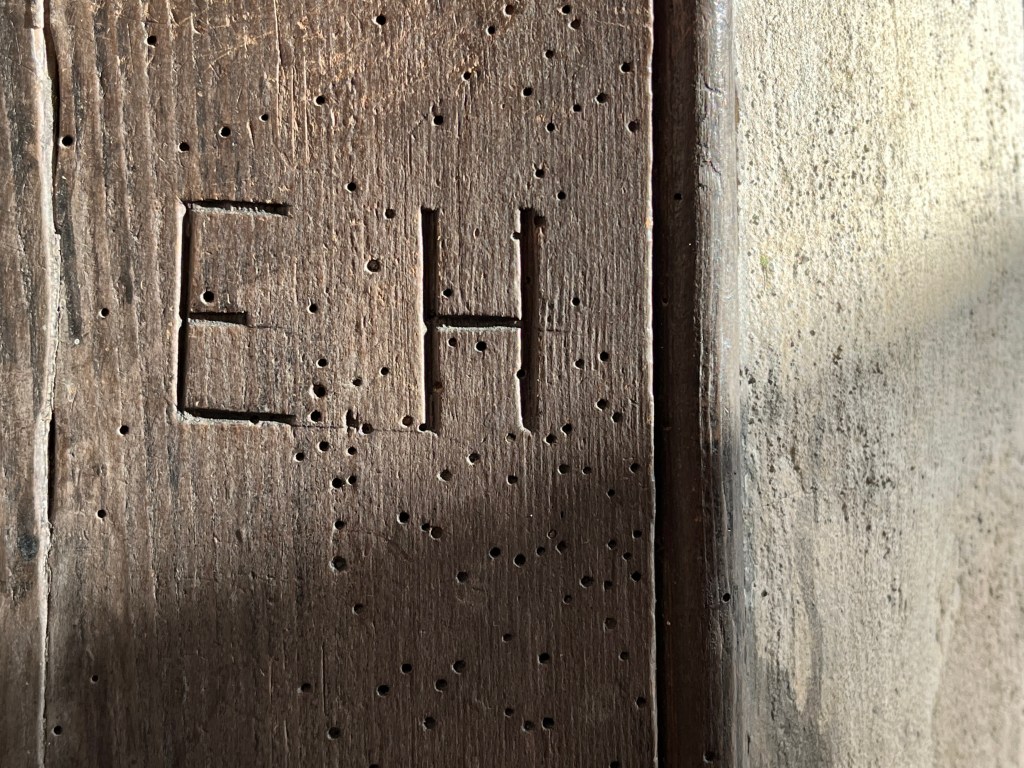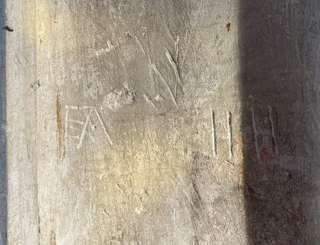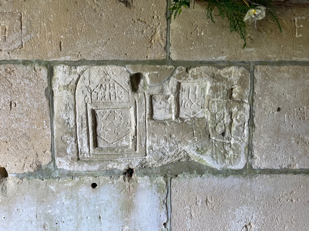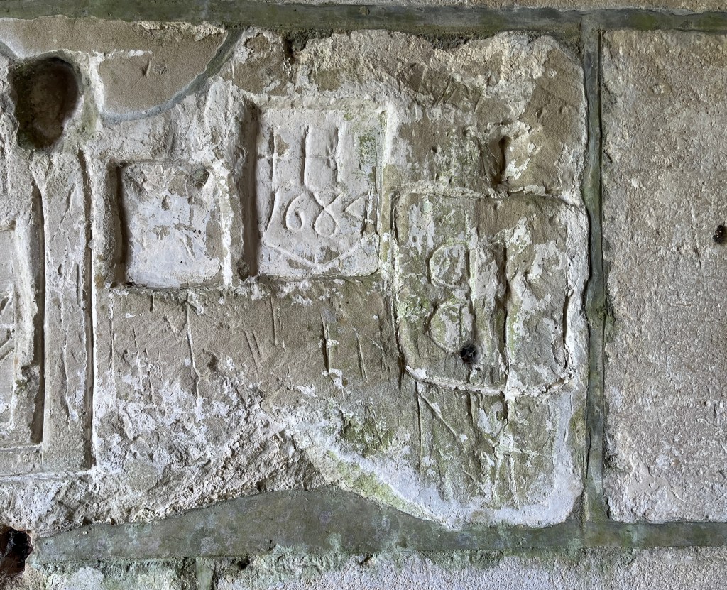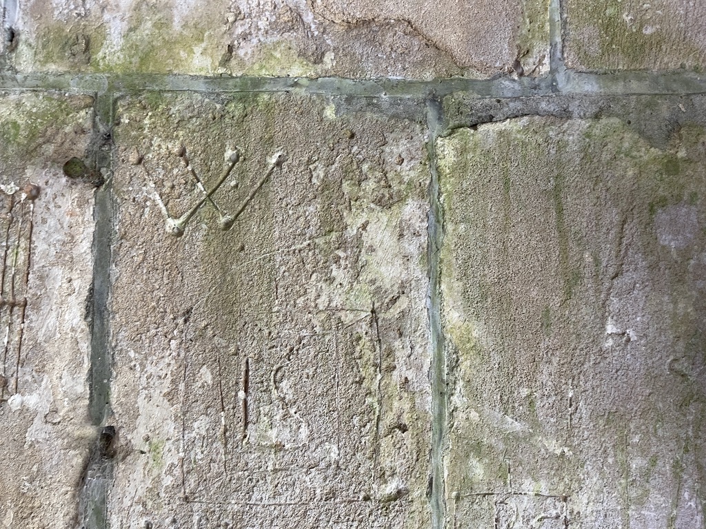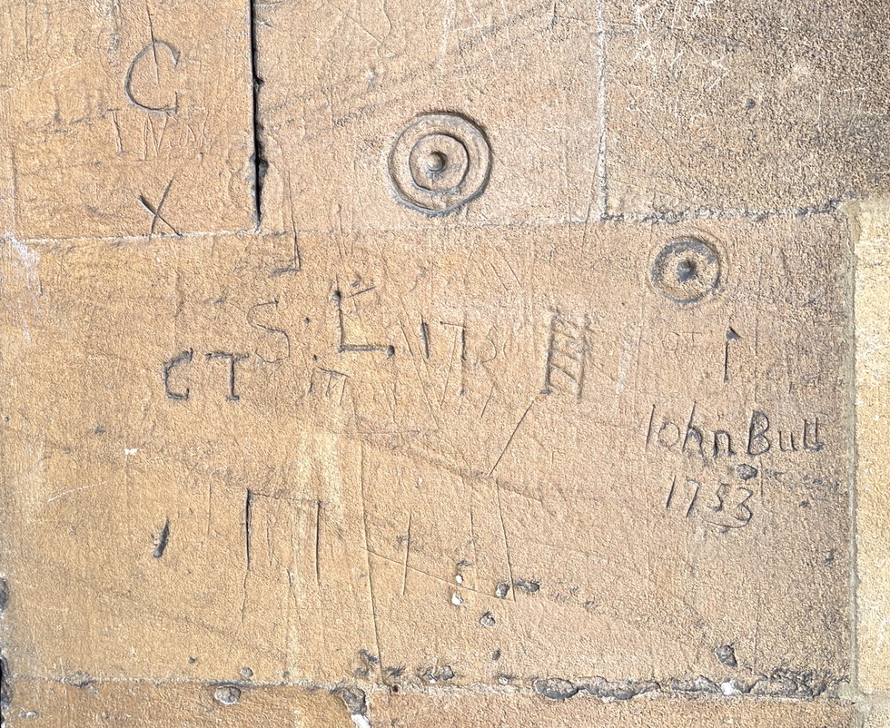 On each side jamb of the entrance to the Museum, there is a fine collection of graffiti of several kinds. Below is a selection of the marks from either side, left first. These include names and dates, with a Bull (1753) on one side, and a later Bull (1891) on the other; and a couple of probable mason’s marks, together with random scratchings accumulated over time.
