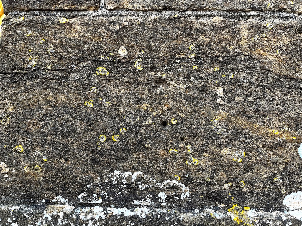 Beneath Dial 2 and far more visible. There are 6, perhaps 7 lines, of which the the afternoon lines are much the clearest. The noon line has an unusually prominent pock. The adjacent lines LRQ are even deeper cut. One is also elongated, probably indicating the most significant Mass of the day. One of the fainter lines LHS heads ineffectively above the horizontal. The gnomon hole is surprisingly deep.