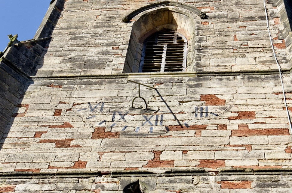 The dial is on the south wall of the tower, 8m up. Markings a bit unclear. Shows 8am to 7pm, 15 min marks. Half hours marked by triple dot pattern. Mounted in flint rubble wall of tower – rebuilt in 17th C – below and to the right of the clock. BSS Record