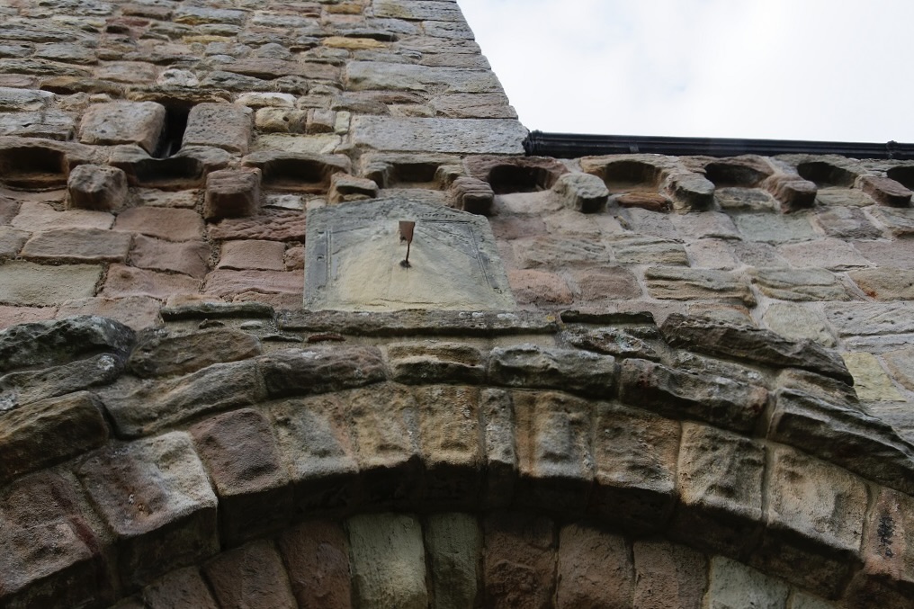 A weathered C18 vertical dial with a short gnomon that casts a very visible shadow. The shape of the dial stone, with its pedimented square, is very pleasing. The lines are enclosed in a frame, with Arabic numerals from 6 to 6 around its edge. The use of Arabic numerals rather than Roman suggests a later dial of this period. 9 lines are detectable, some only just. Only 6 numerals are clear. I can’t make any sense of the remains of the inscription. I wondered if some of the sandstone – especially LLQ – is repair or natural deterioration. Expanding this very good photograph, I think the latter: the dial is showing the signs of its age.