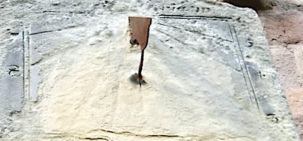 A fine dial in very good condition for its age. The gnomon is an amusing extension of the sun’s nose. I took the design LL corner to be an hour-glass, which would be appropriate. In close-up I wonder if it is a religious symbol; and if the design LR corner is a square and compass.