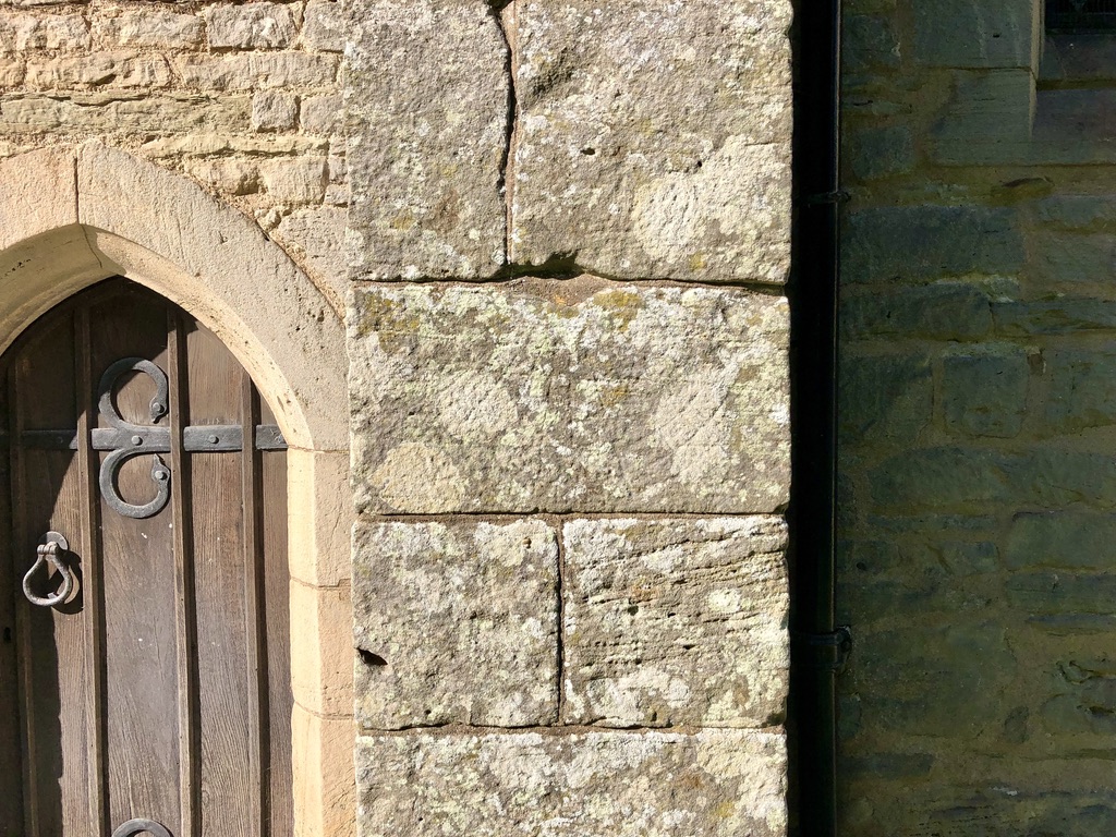 Cut into the large quoin stone on R. side of the priest’s door and spanning its width. The dial has a relatively complex design, perhaps combining its practical purpose with decorative effect. Erosion has made interpretation difficult. The style hole, now a small cave, is in the mortar line. The lower R quadrant shows part of 3 concentric semi-circles. There’s a hint – best seen top L – that at least the inner circle line continued above the horizontal. There’s little other sign of a more complete circle.