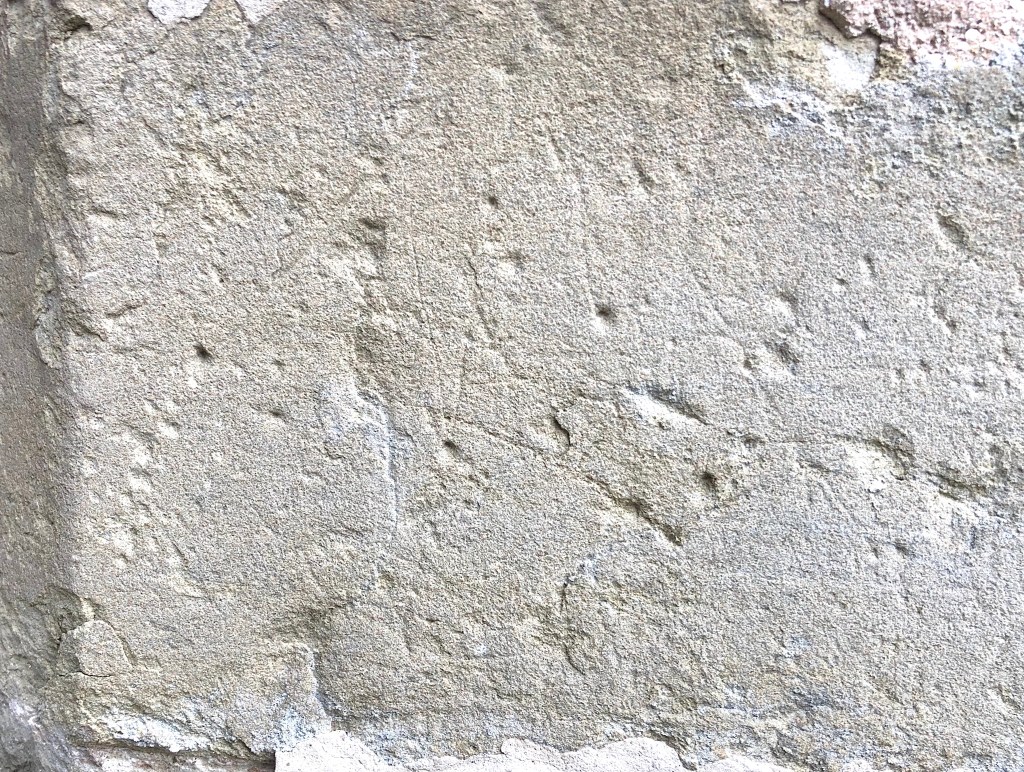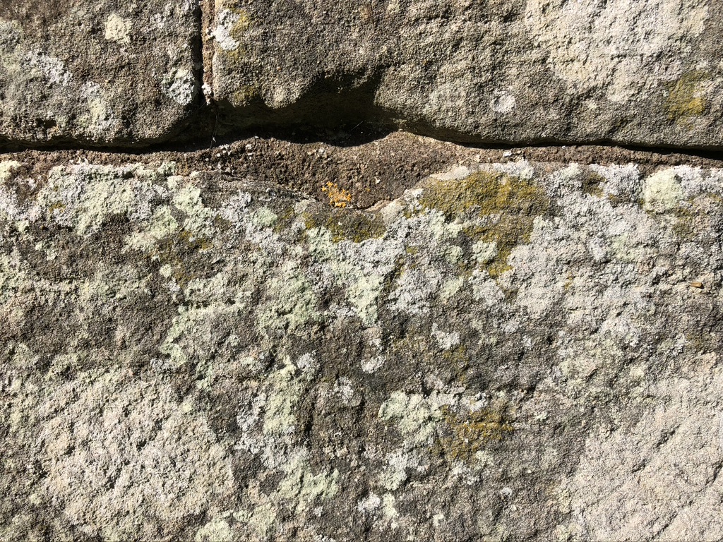 Erosion and lichen obscure the finer details. BSS records 7 lines but a close-up photo in sunlight reveals about a dozen, with possibly some shorter lines (half-hour marks?). There are also pocks, 2 or 3 of which could relate to the dial – in particular the 2 ‘terminal’ ones adjacent to the noon line just above the mortar.