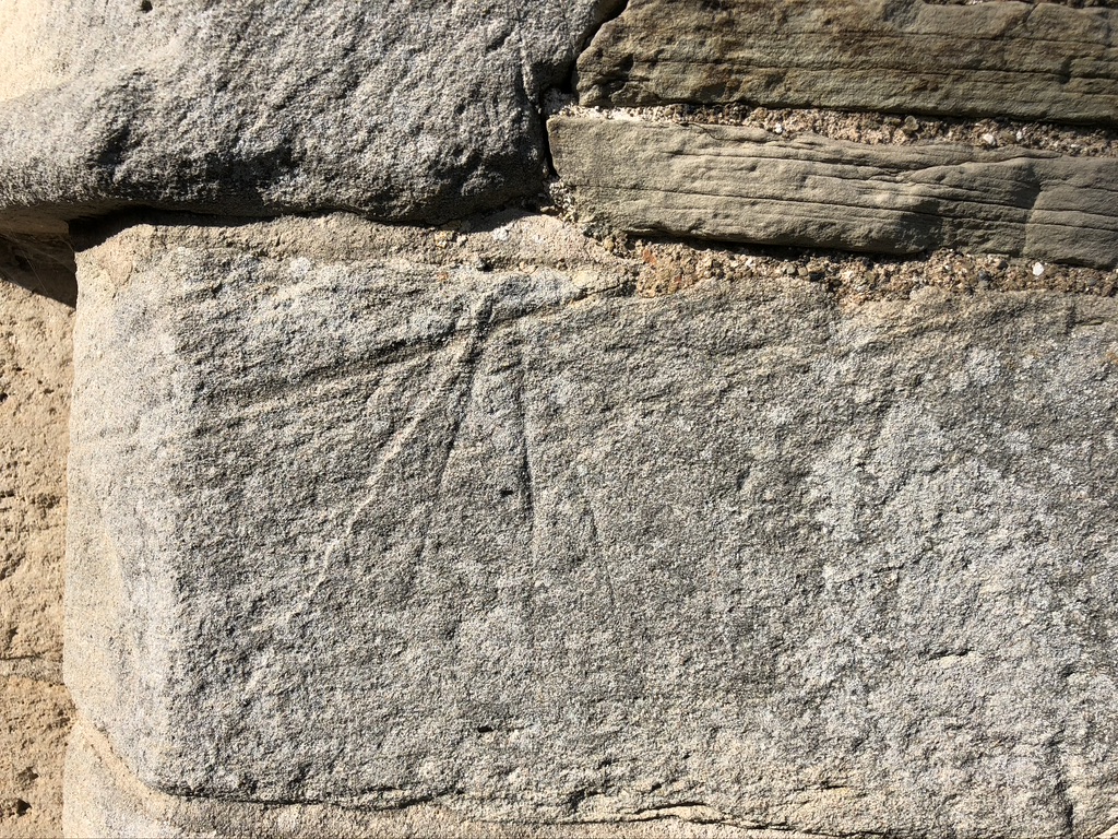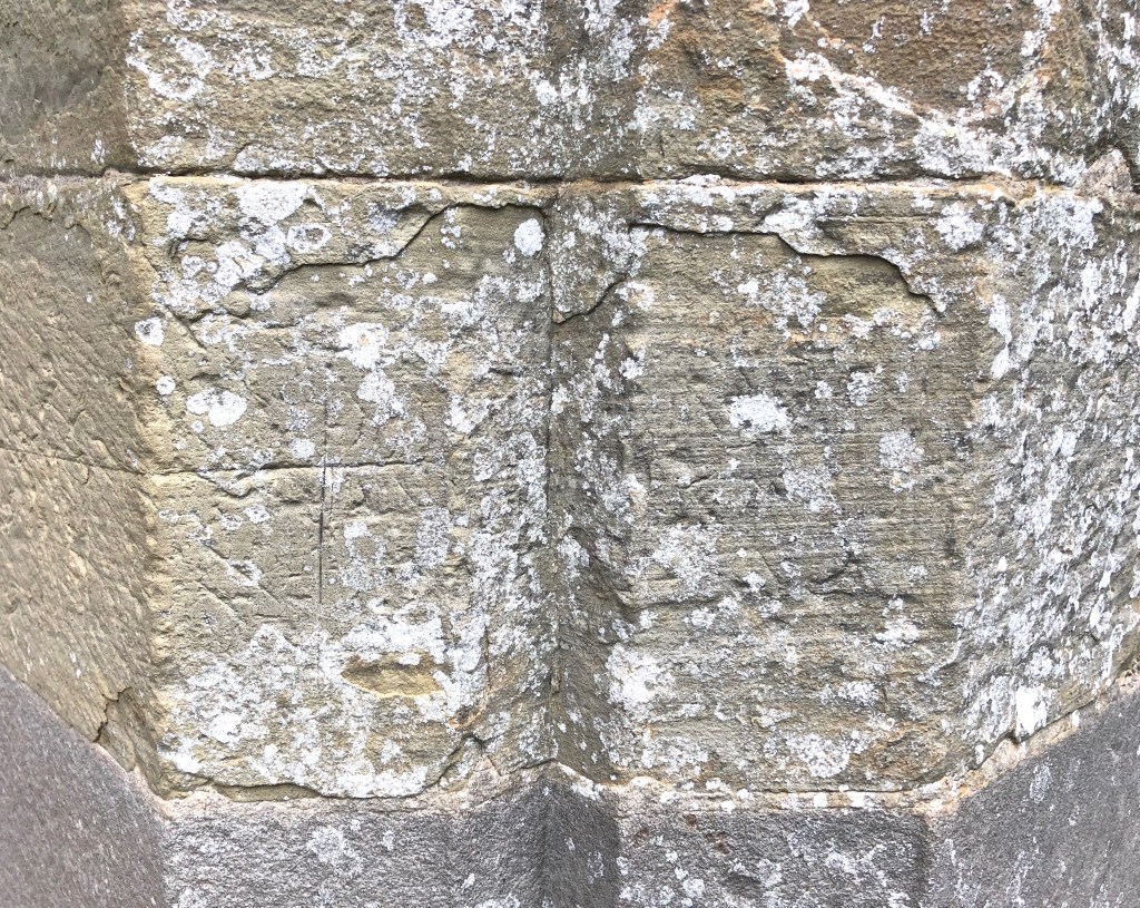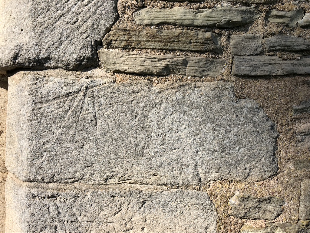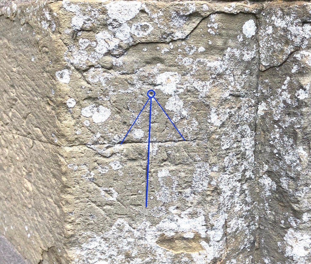 On the R. side of the S. porch, on the stone below the architrave. The stone below has marks that are probably apotropaic. 3 definite lines descending from the mortar line and through a slanting line that looks most like a fault in the stone – that may also apply to the 4th ridged line on the left side, or perhaps it was cut / added at a different time.