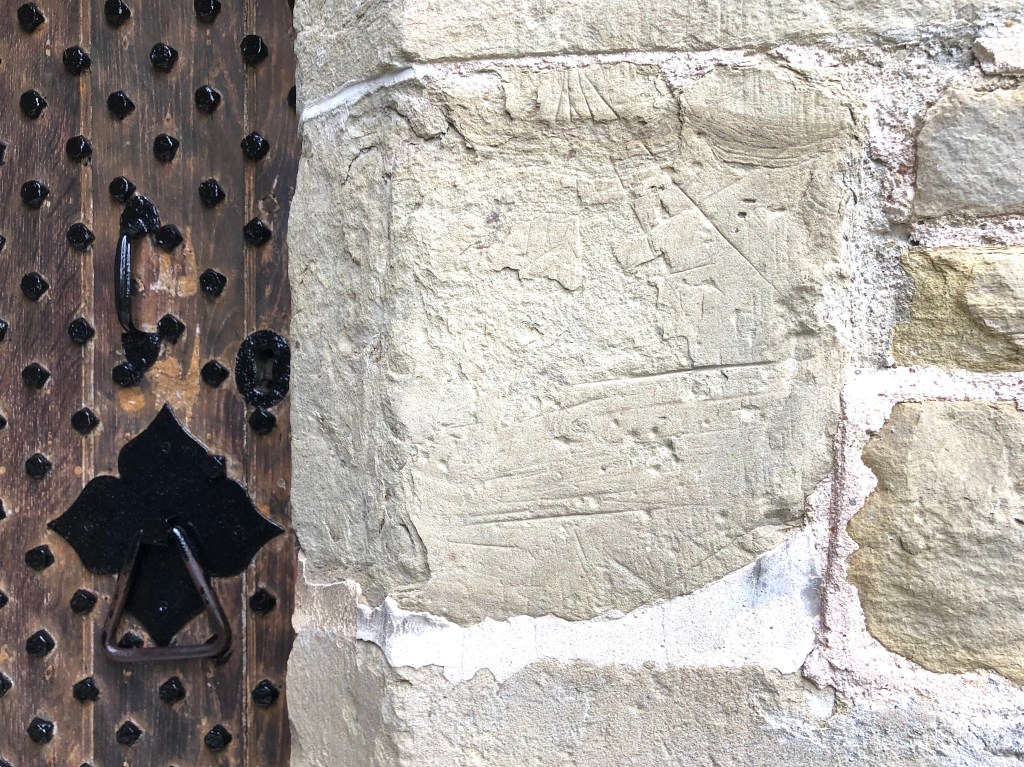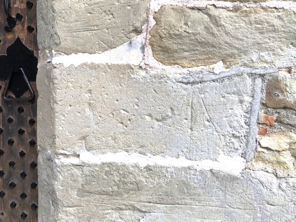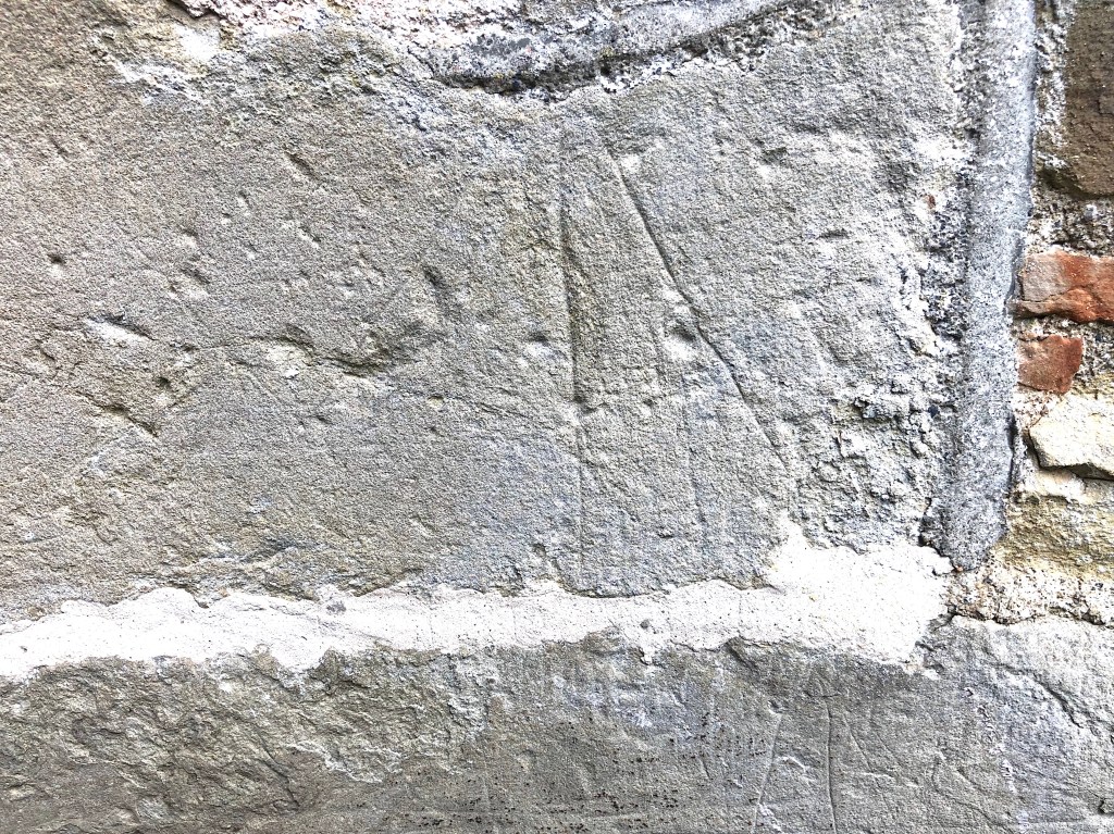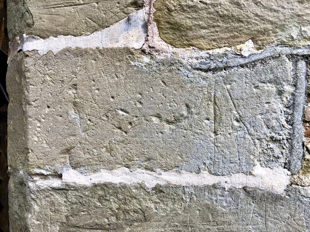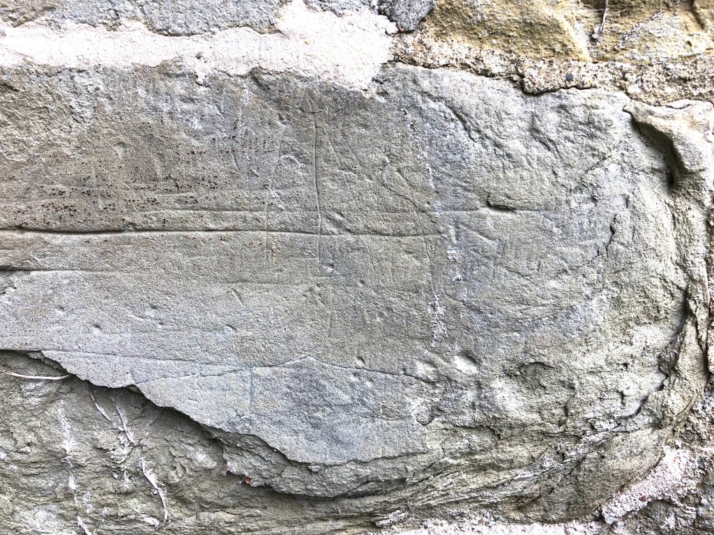 On darker stone and in shadow on a buttress, it would be easy to miss this dial. If it is one. At the time, I thought it was; and looking weeks later at the photos I still think so, just a noon line and what could be a Mass line.