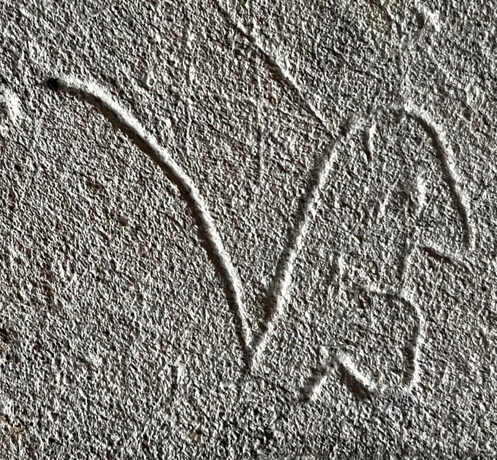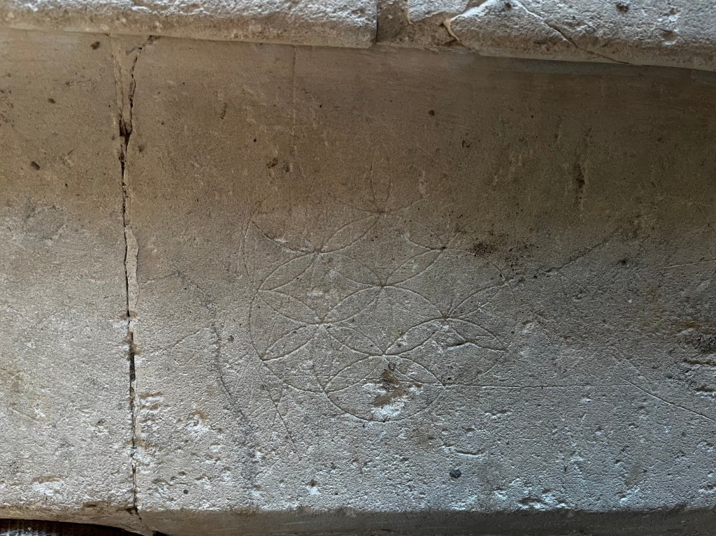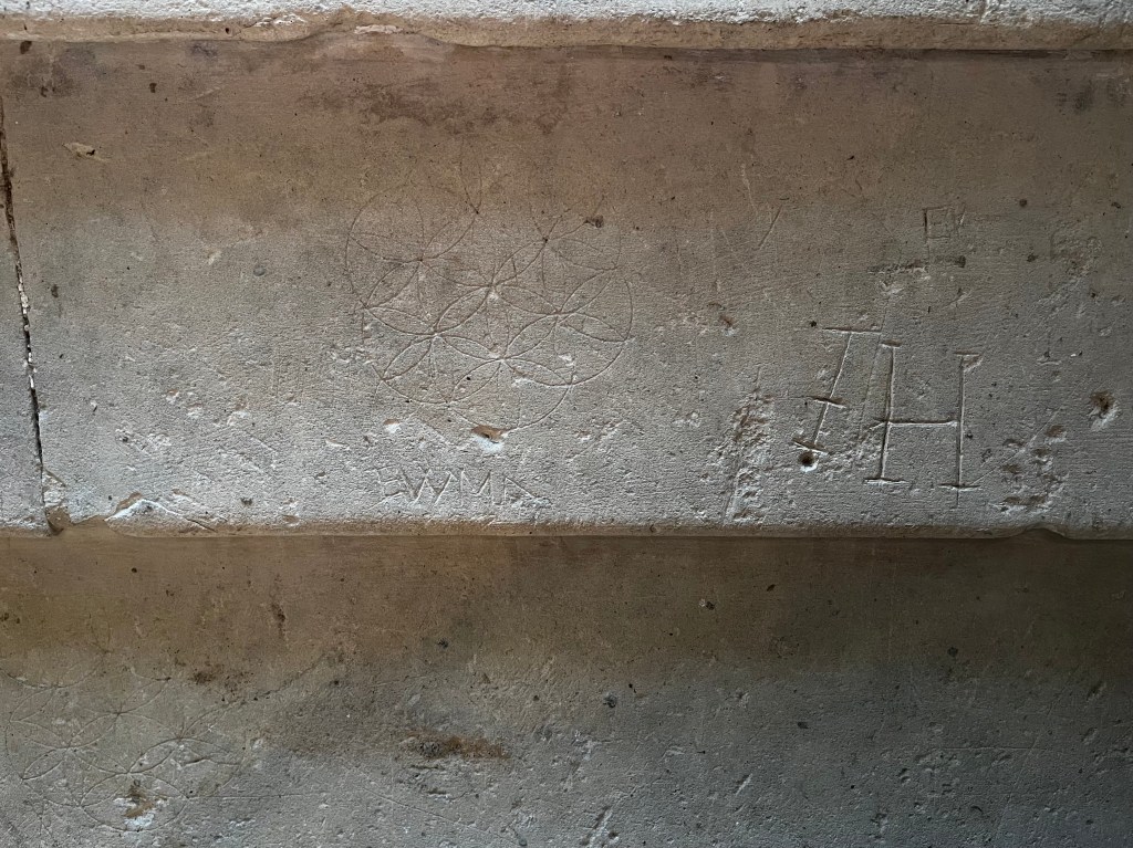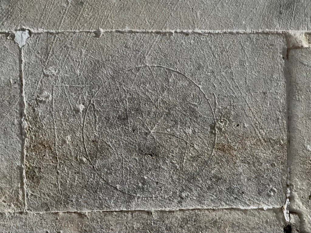 A simple deeply-scored dial that cuts into a quatrefoil ‘4-leaf cover’ compass design, presumably apotropaic. The church has a great many protection marks of all kinds, together with several shields. I may feature a selection in due course.