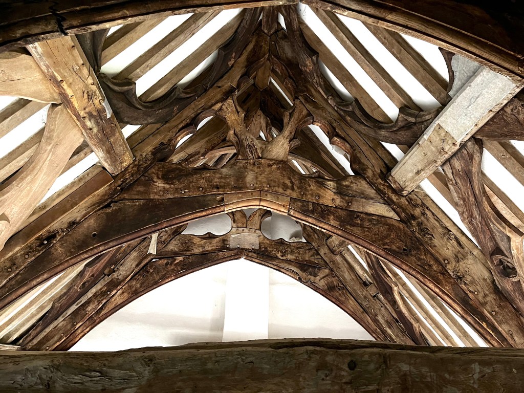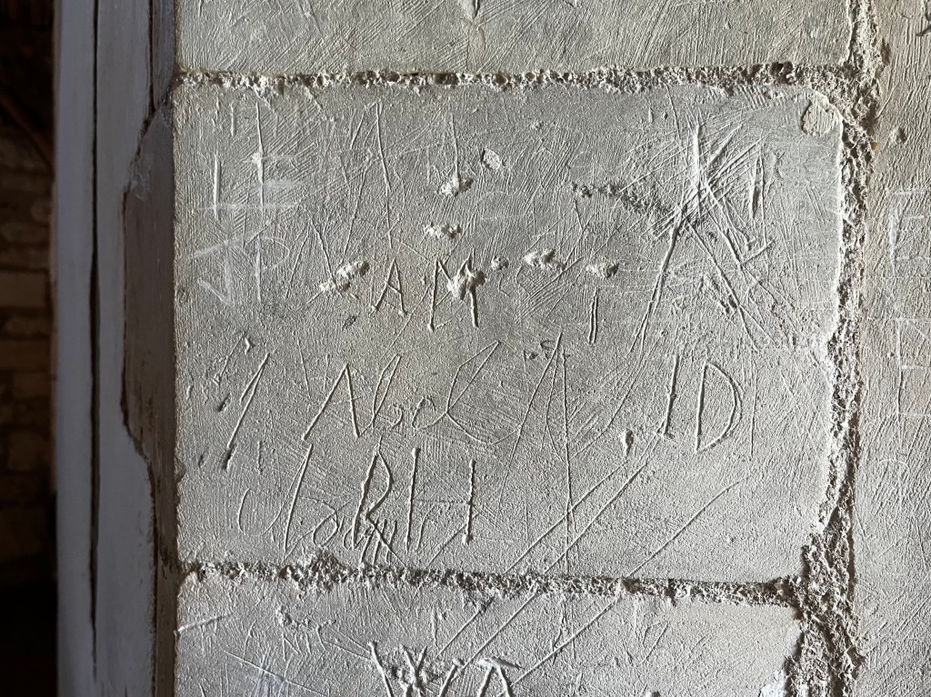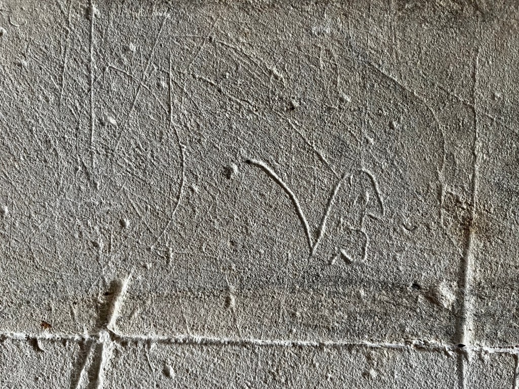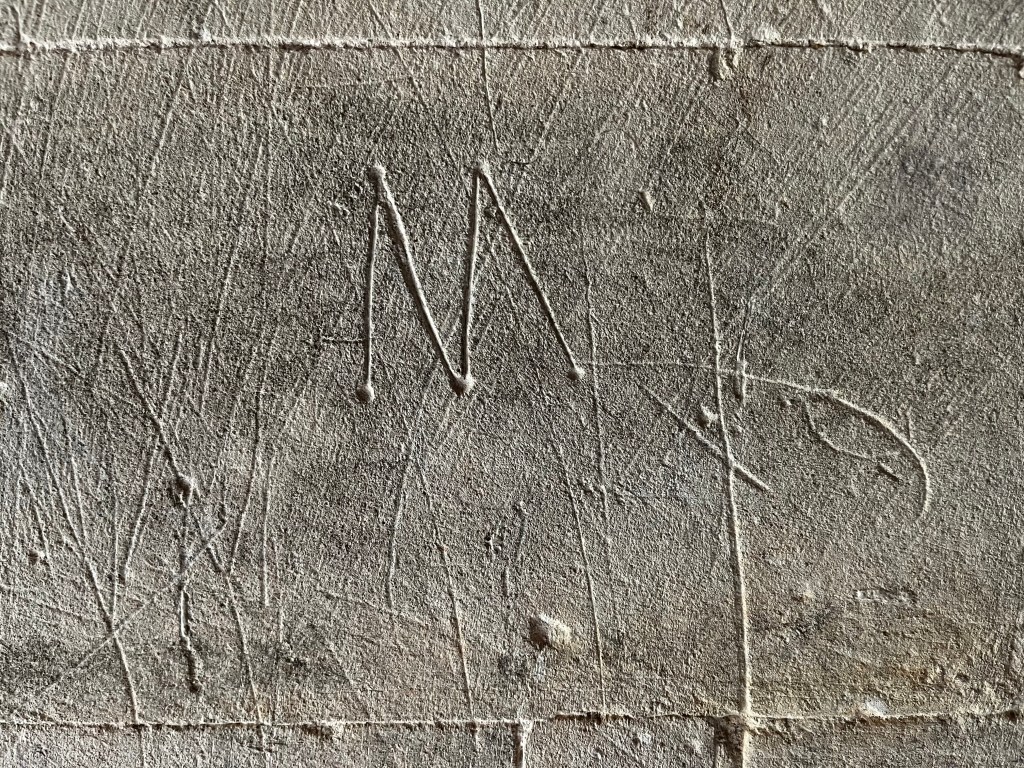A simple deeply-scored dial that cuts into a quatrefoil ‘4-leaf cover’ compass design, presumably apotropaic. The church has a great many protection marks of all kinds, together with several shields. I may feature a selection in due course.